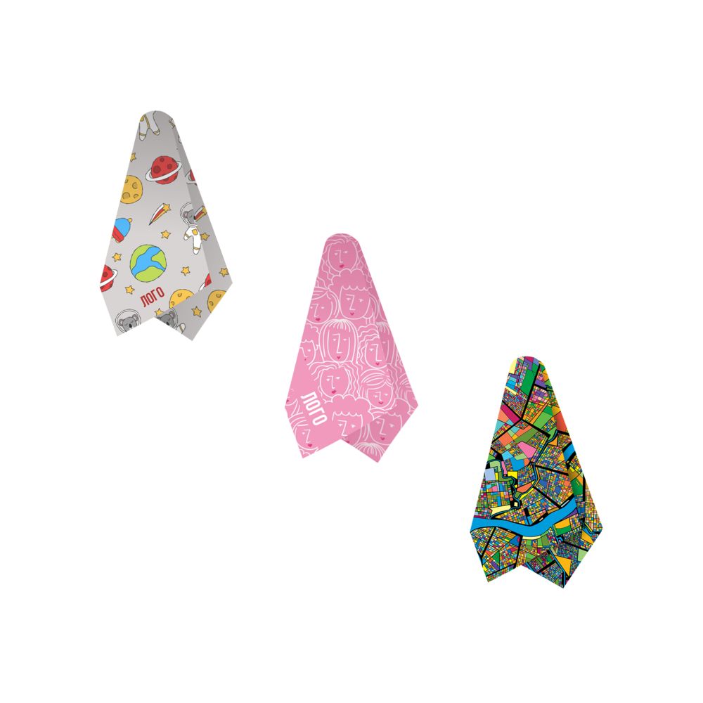 Лицевая сторона полотенца похожа на велюр. Синтетическое полотно и короткостриженые петельки позволяют нанести полноцветное изображение методом сублимационной печати. Оборотная сторона выполнена из натурального хлопка и выглядит как обычное махровое полотенце. Она хорошо впитывает воду и приятна к телу. Края полотенца обработаны подгибкой.