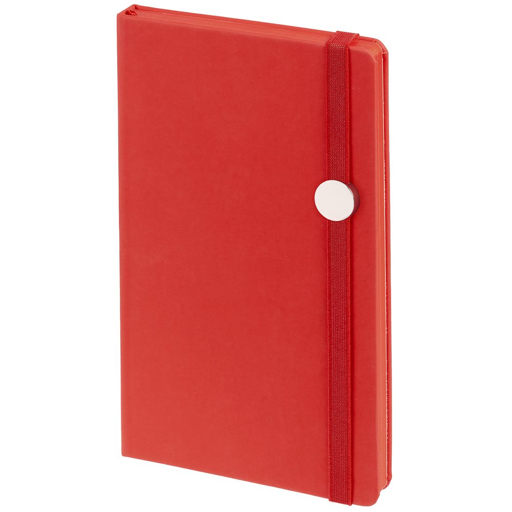 Блокнот в твердой обложке, выполнен из материала Soft Touch Ultra, красный РР, дополнен резинкой и ляссе в цвет обложки.