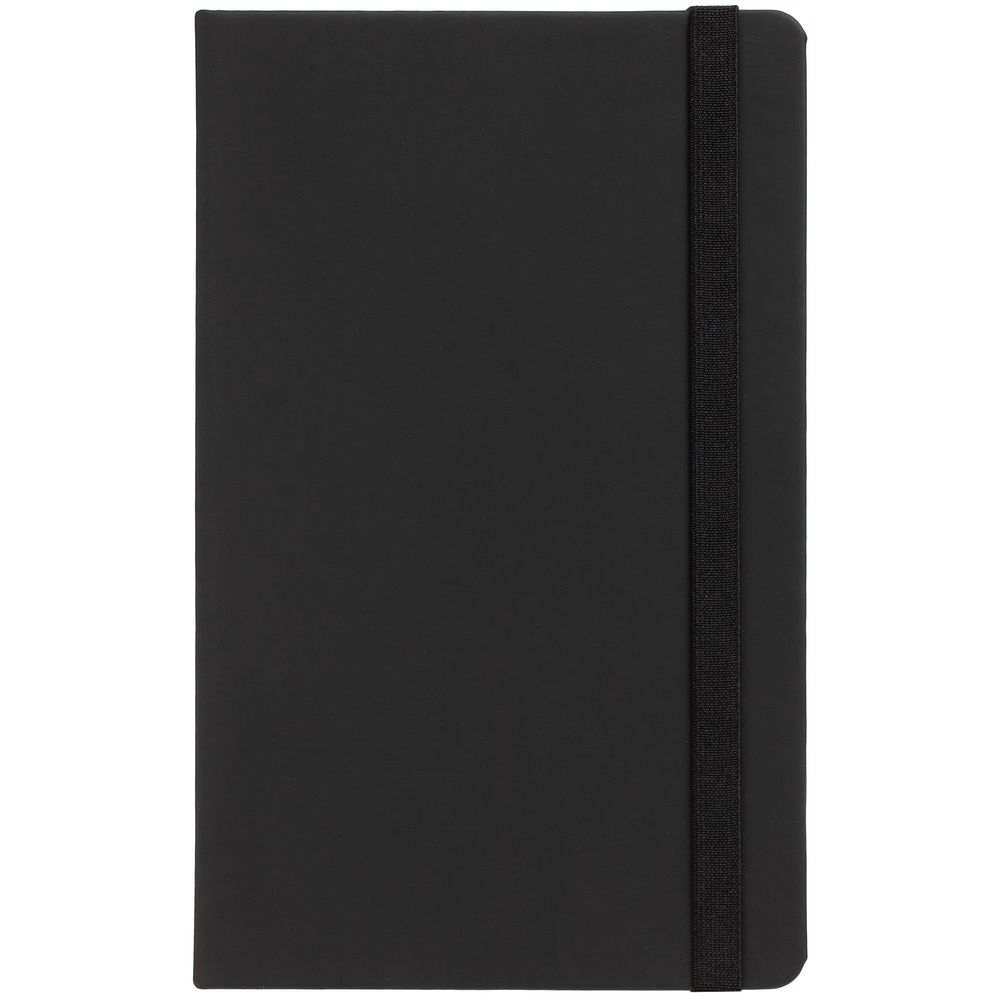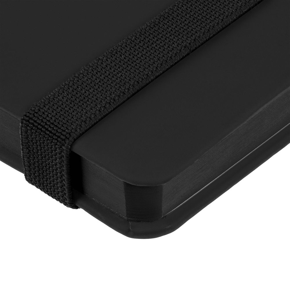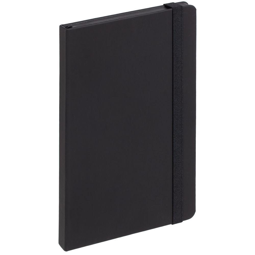 Блокнот в твердой обложке, выполнен из материала Soft Touch, черный АА, дополнен резинкой и ляссе в цвет обложки.