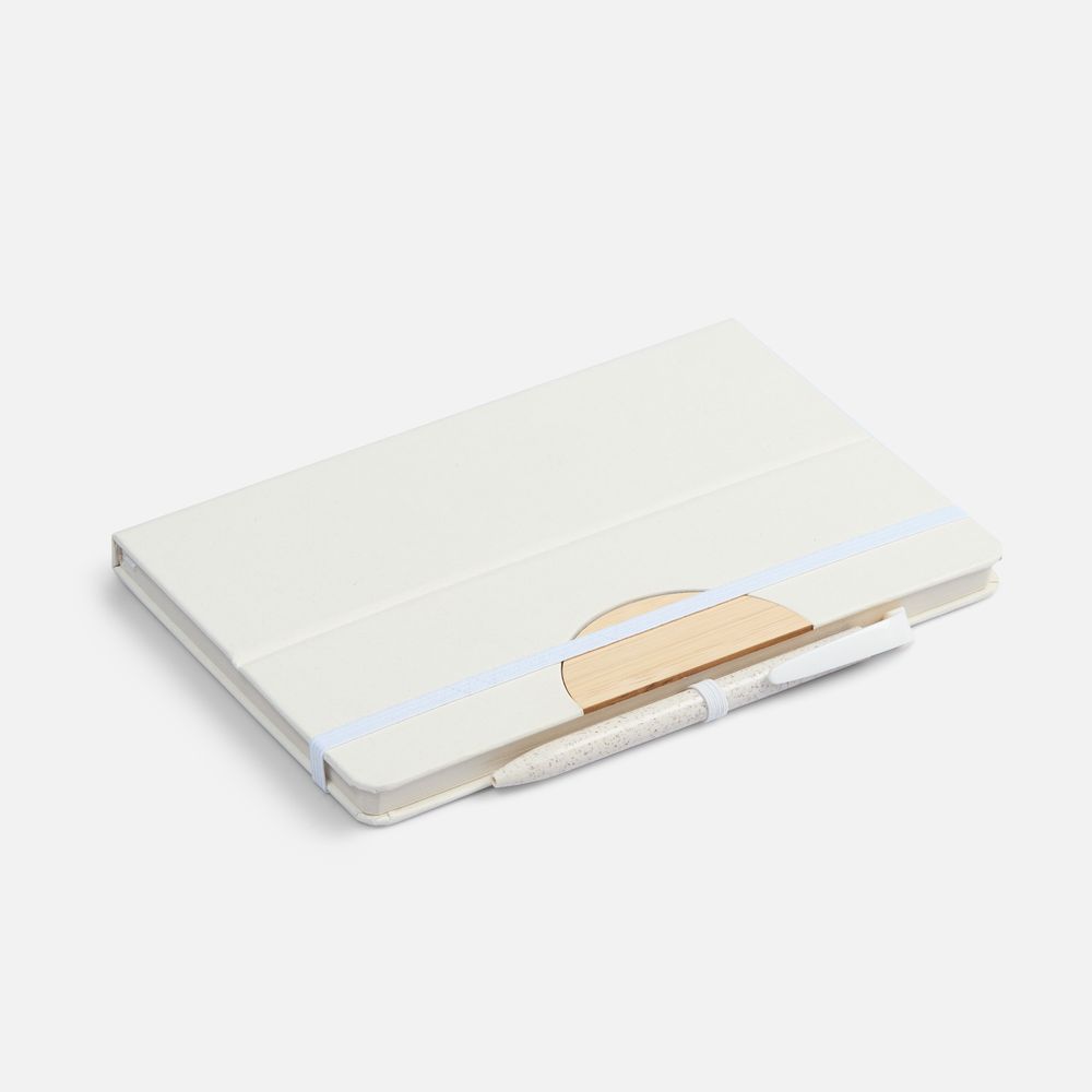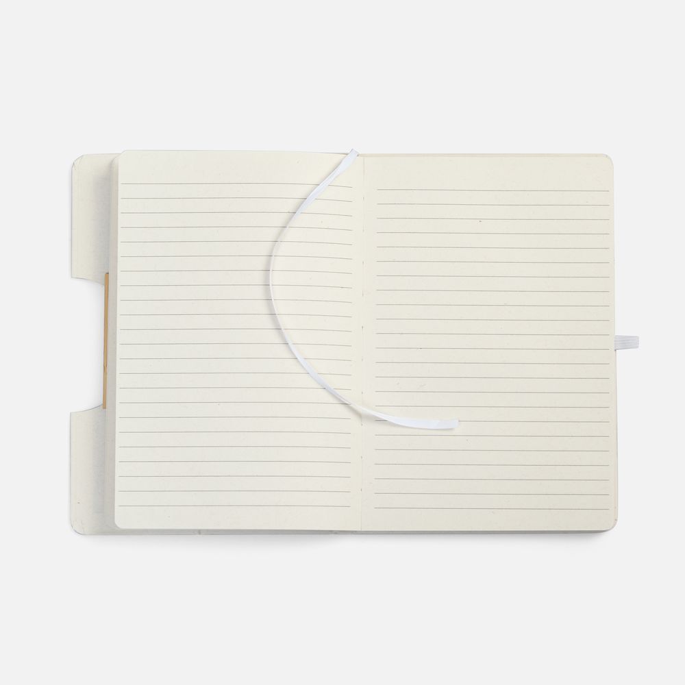 Блокнот из переработанных молочных пакетов, дополнен цветными петлей-резинкой для ручки, белым ляссе и резинкой на обложку.