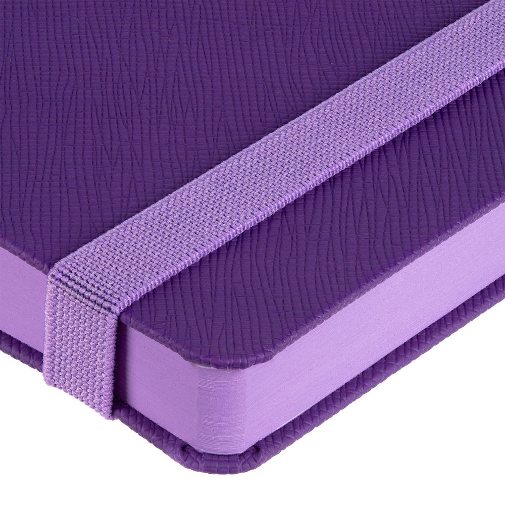 Ежедневник с твердой обложкой выполнен из материала Nice Touch, фиолетовый UU, и дополнен резинкой шириной 1 см и ляссе сиреневого цвета.