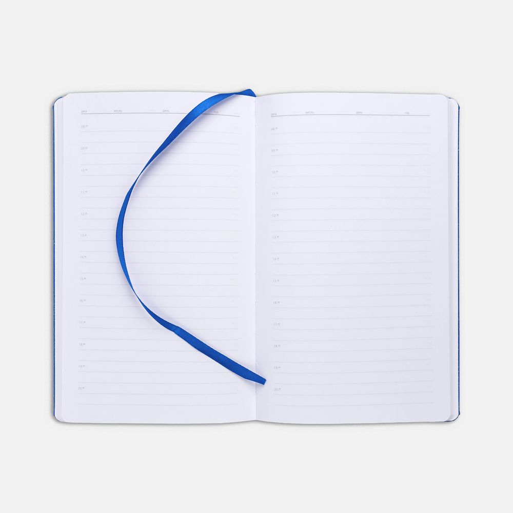 Ежедневник с твердой обложкой, выполнен из материала LaFite, темно-синий ХХ,дополнен резинкой с металлическим круглым шильдом и ляссе в цвет обложки.