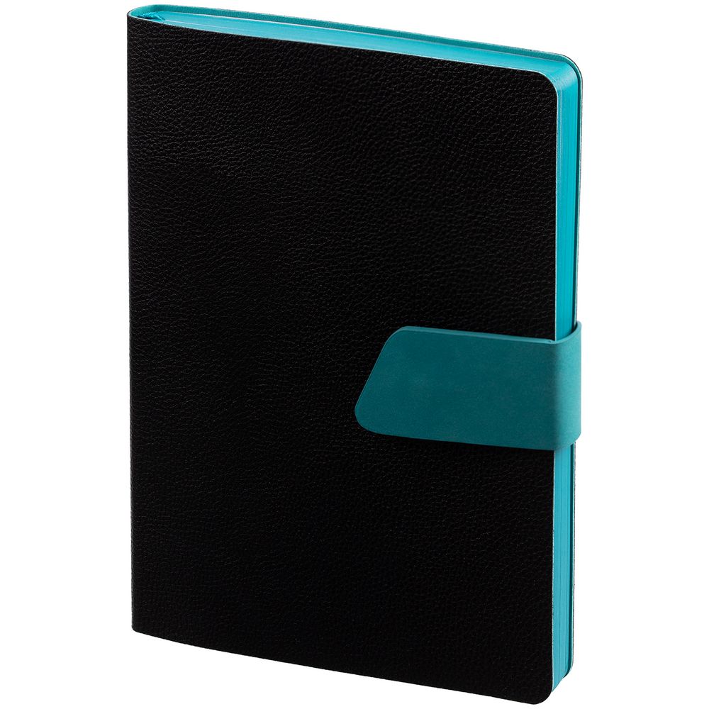 Ежедневник с гибкой обложкой, выполнен из материала La Fite, черный АА и Nubuck, цвет морской волны II, дополнен бирюзовым ляссе и хлястиком на кнопке.