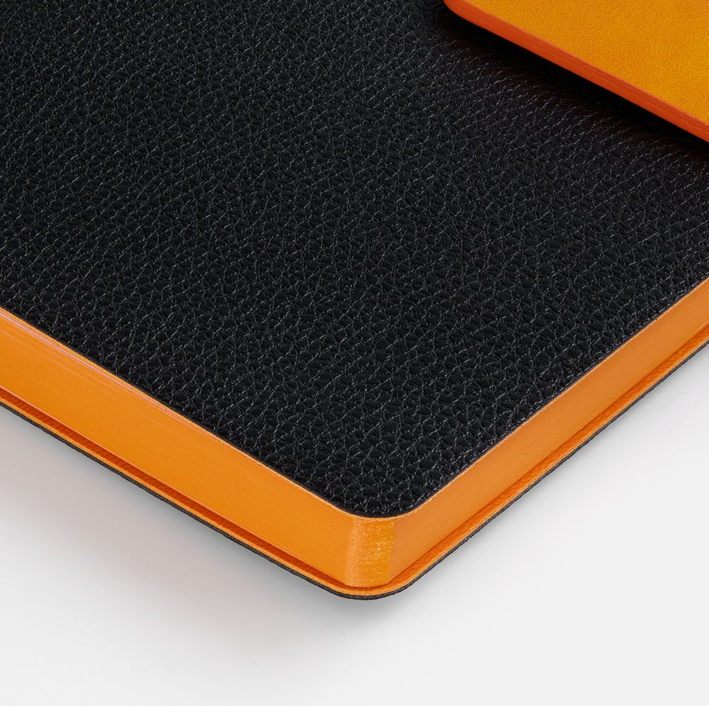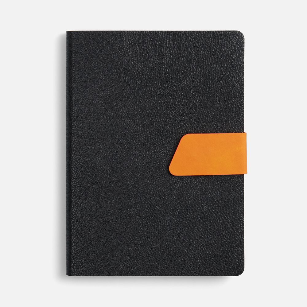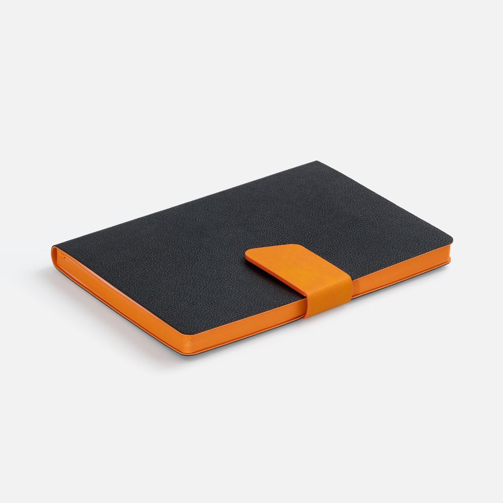 Ежедневник с гибкой обложкой, выполнен из материала La Fite, черный АА и Nubuck Touch, оранжевый, дополнен оранжевым ляссе и хлястиком на кнопке.