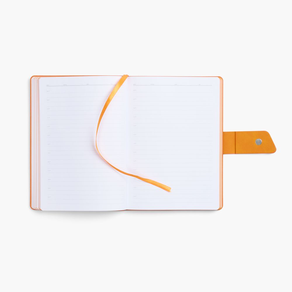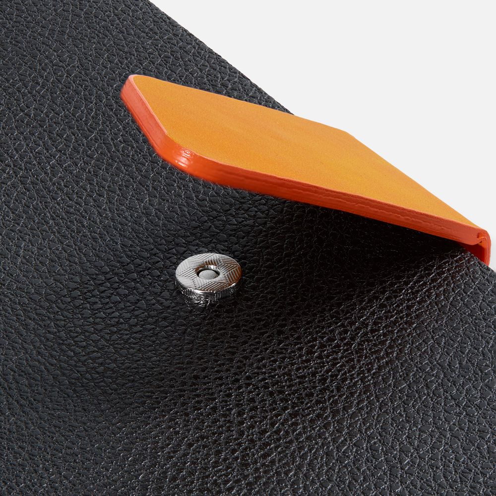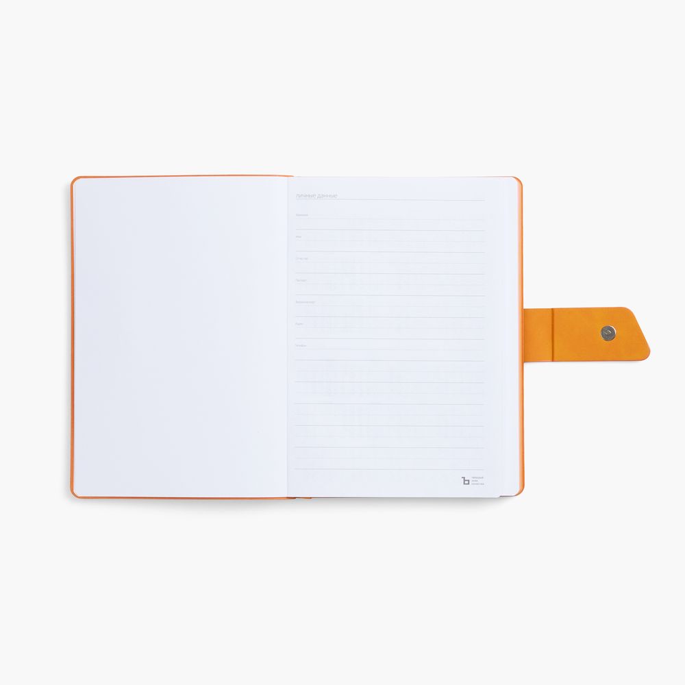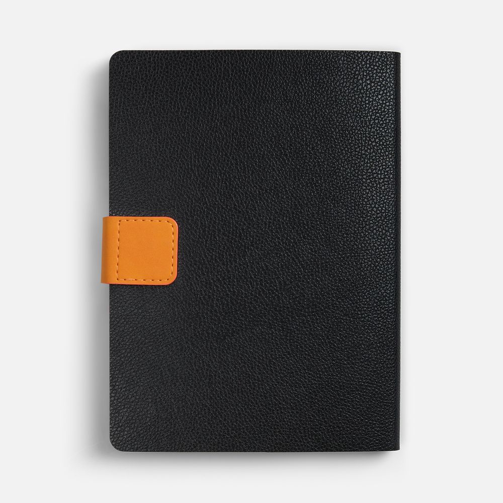 Ежедневник с гибкой обложкой, выполнен из материала La Fite, черный АА и Nubuck Touch, оранжевый, дополнен оранжевым ляссе и хлястиком на кнопке.
