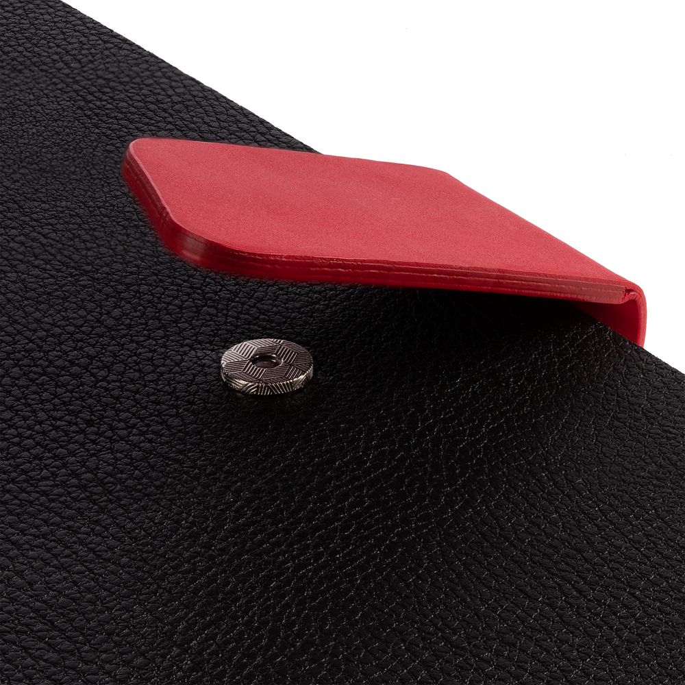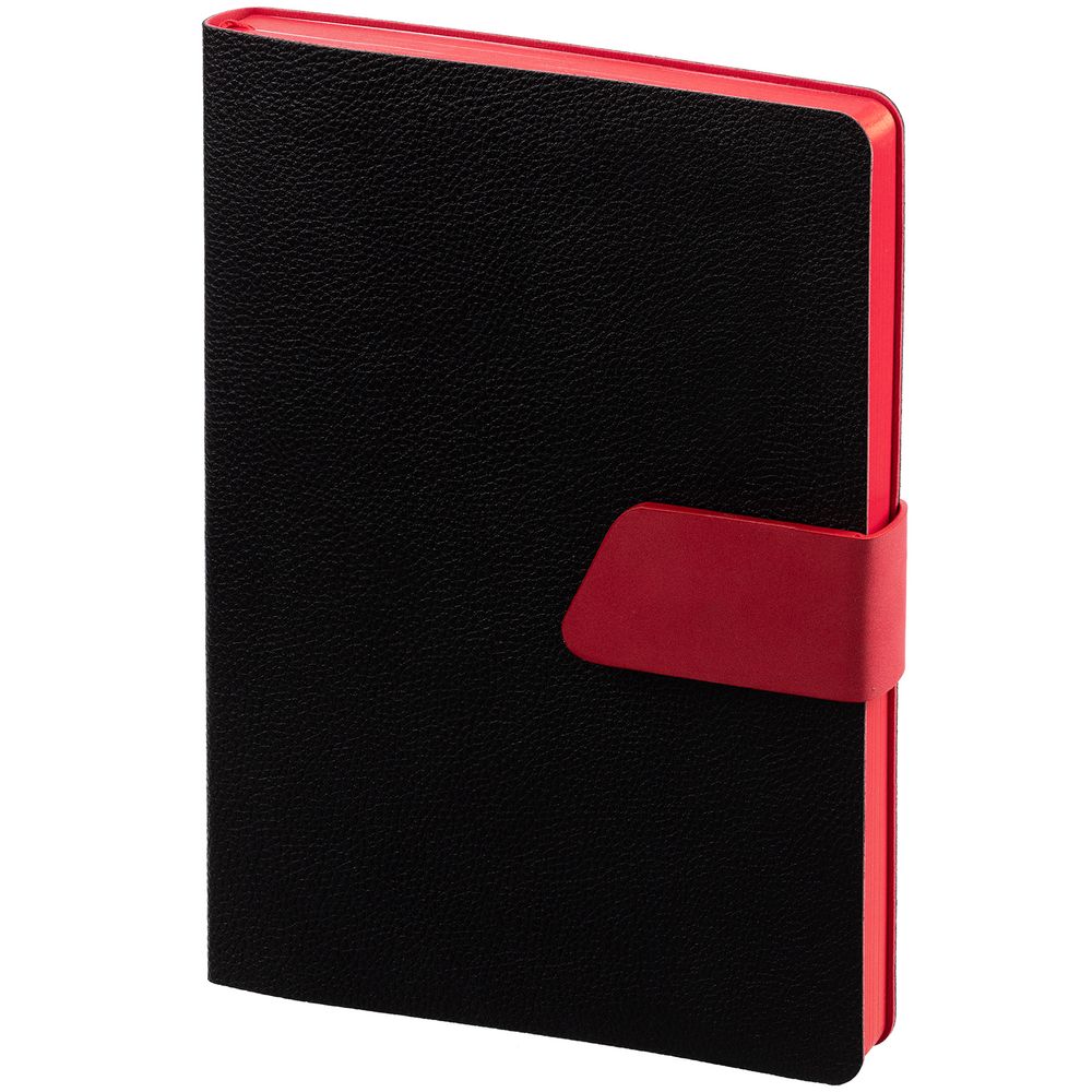 Ежедневник с гибкой обложкой, выполнен из материала La Fite, черный АА и Nubuck, красный РР, дополнен красным ляссе и хлястиком на кнопке.