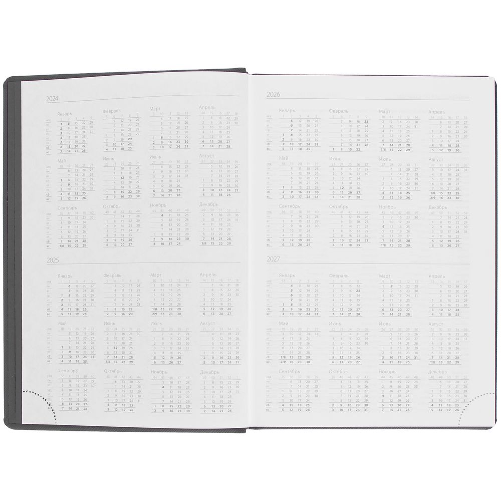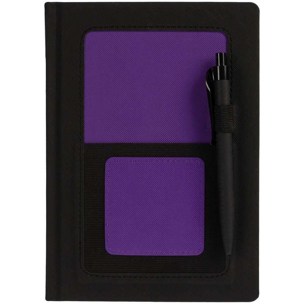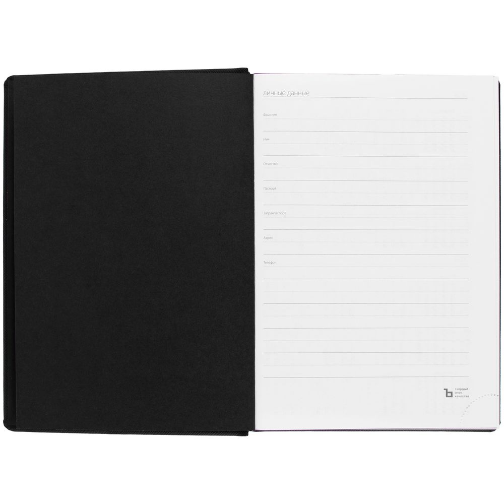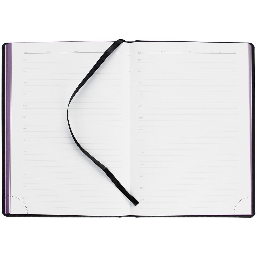 Твердая обложка выполнена из материалов Nice Touch, черный АА, и Canyon, фиолетовый UU. Ежедневник дополнен капталом, резинкой для ручки и ляссе черного цвета.