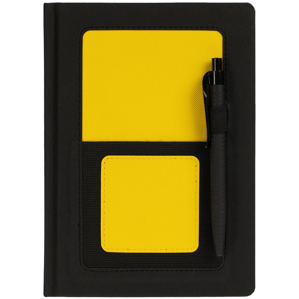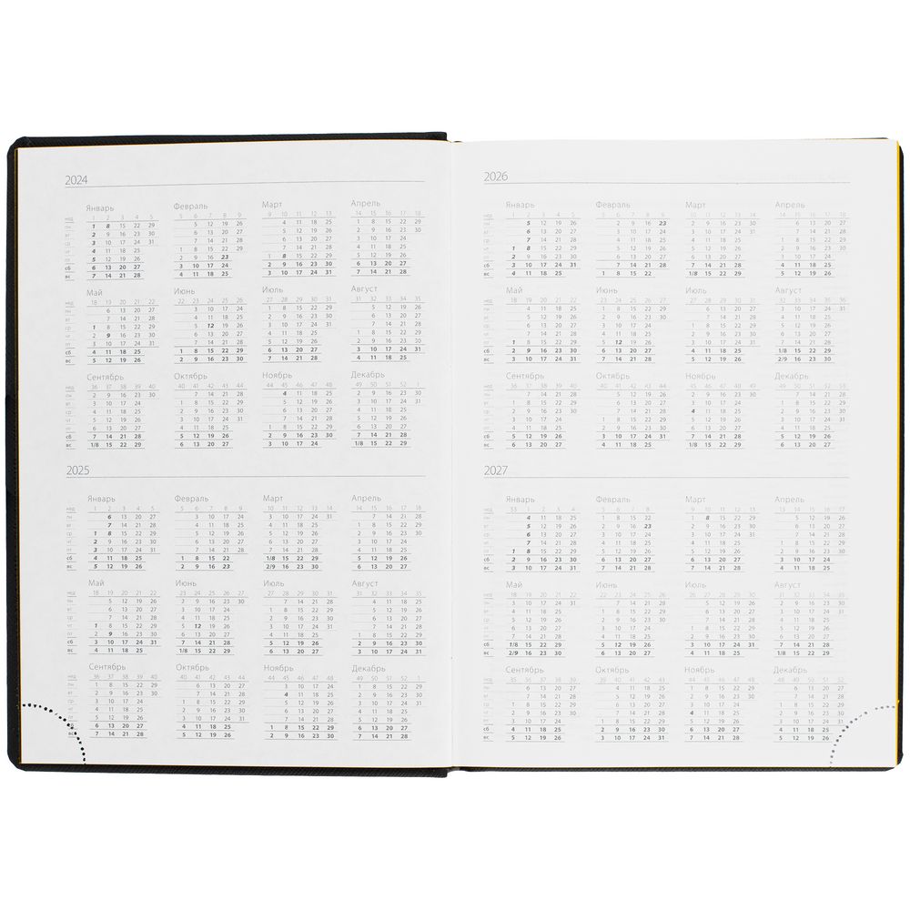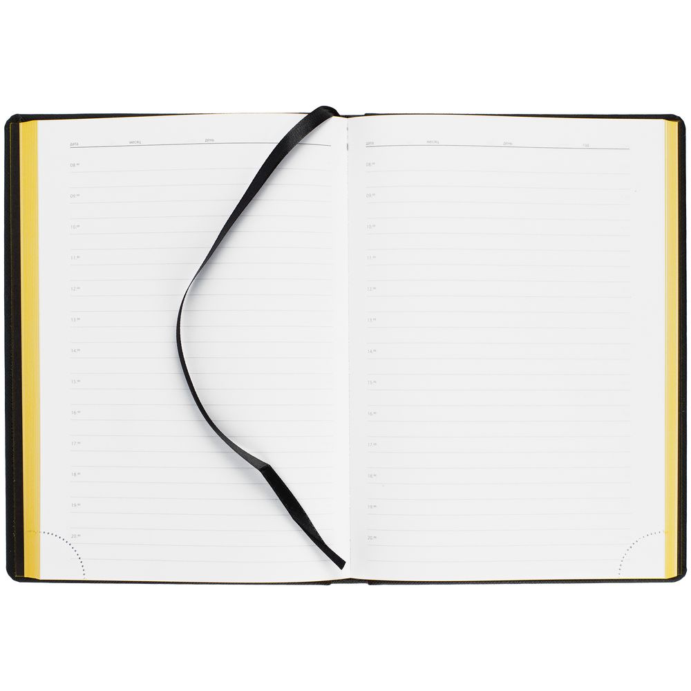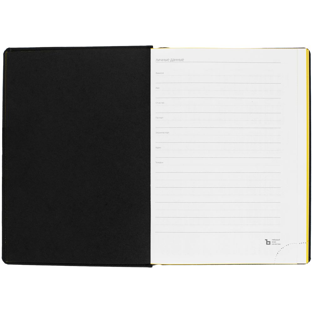 Твердая обложка выполнена из материалов Nice Touch, черный АА, и Canyon, желтый КК. Ежедневник дополнен капталом, резинкой для ручки и ляссе черного цвета.