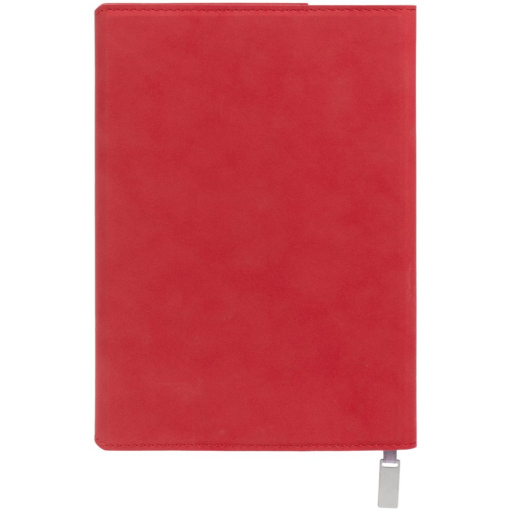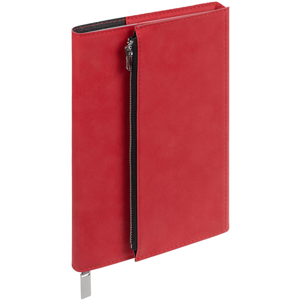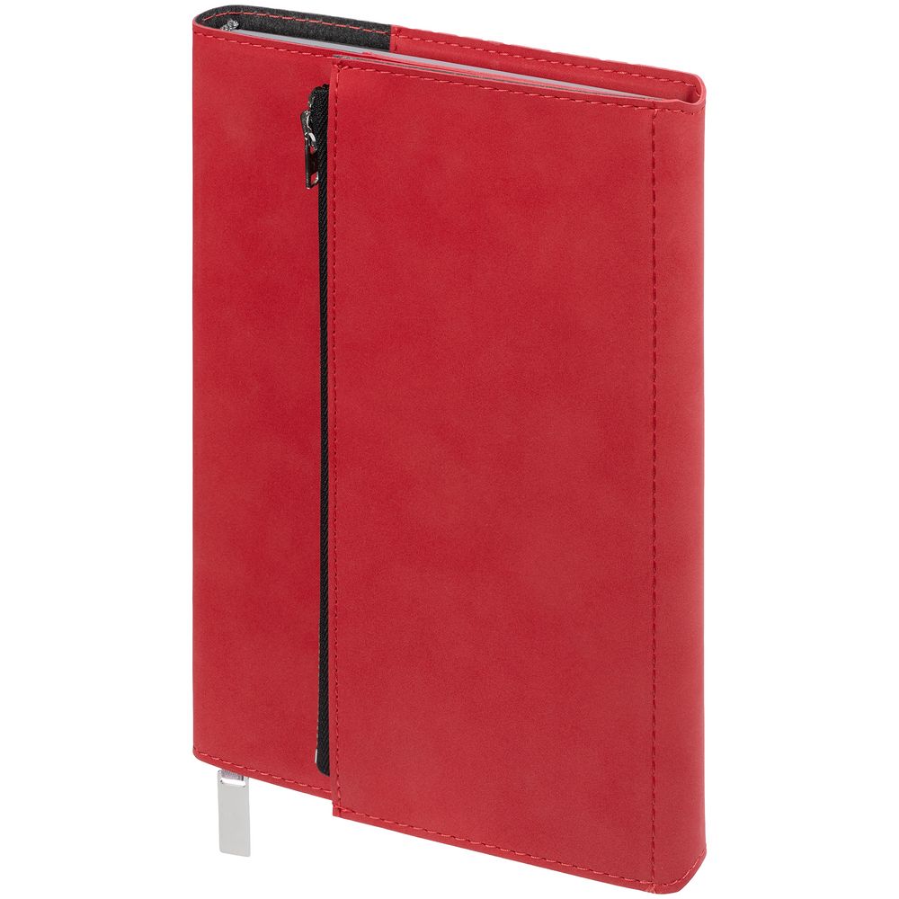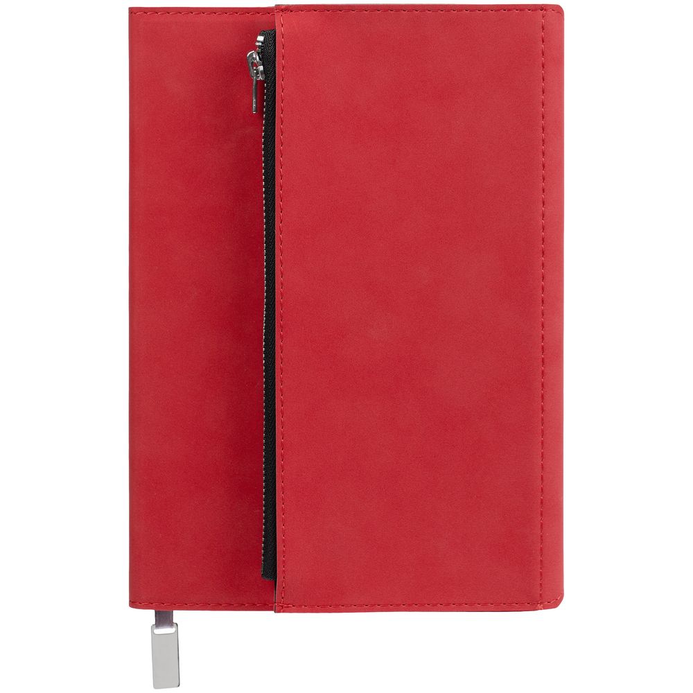 Ежедневник в гибкой суперобложке c карманом на молнии, выполнен из материала Nubuck, красный РР. Дополнен капталом и металлической шильдой на ляссе серого цвета.