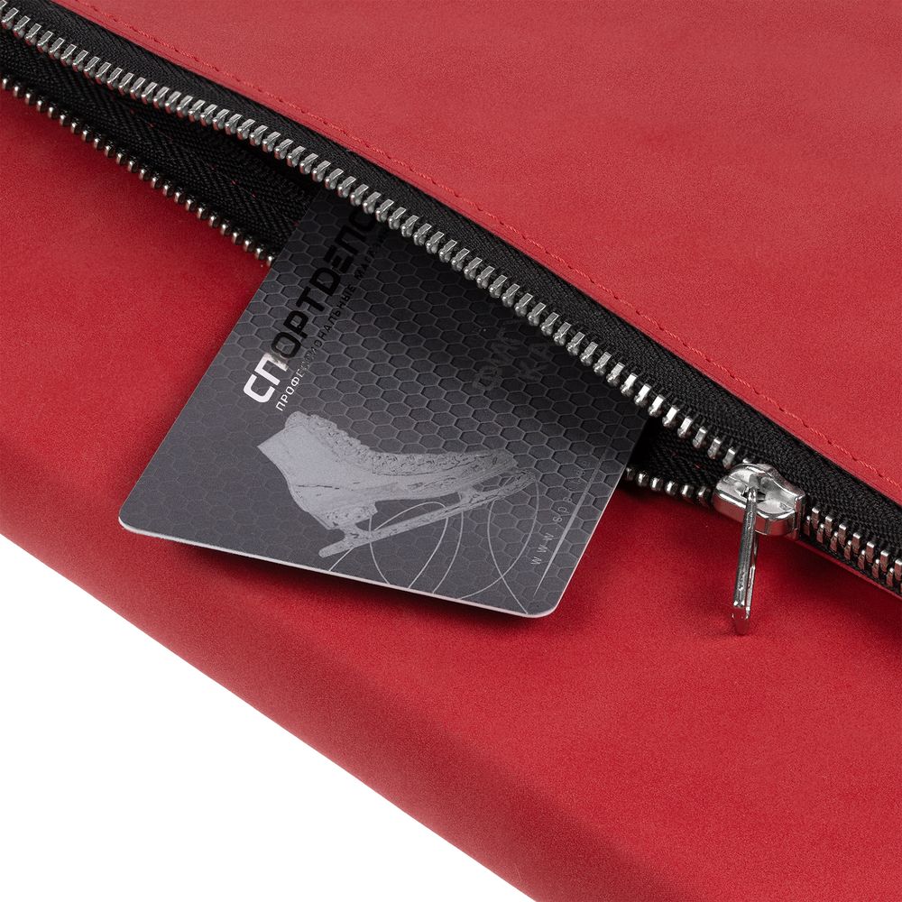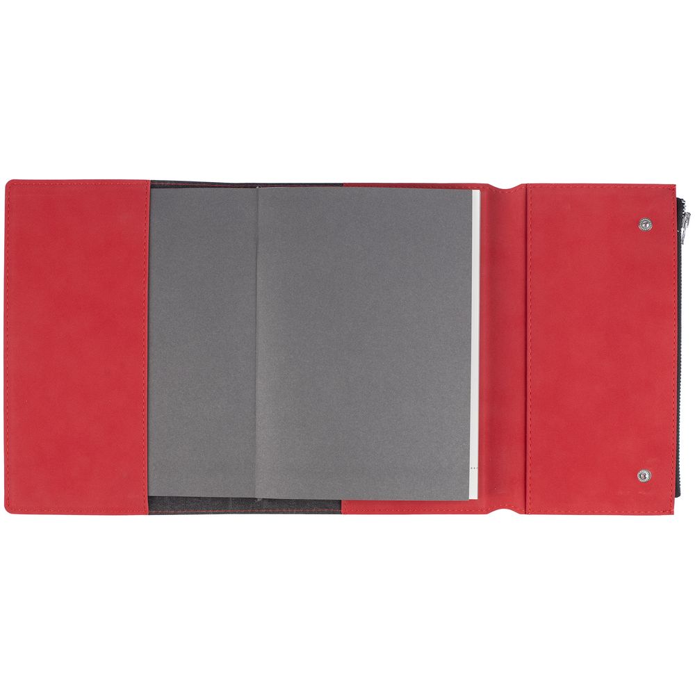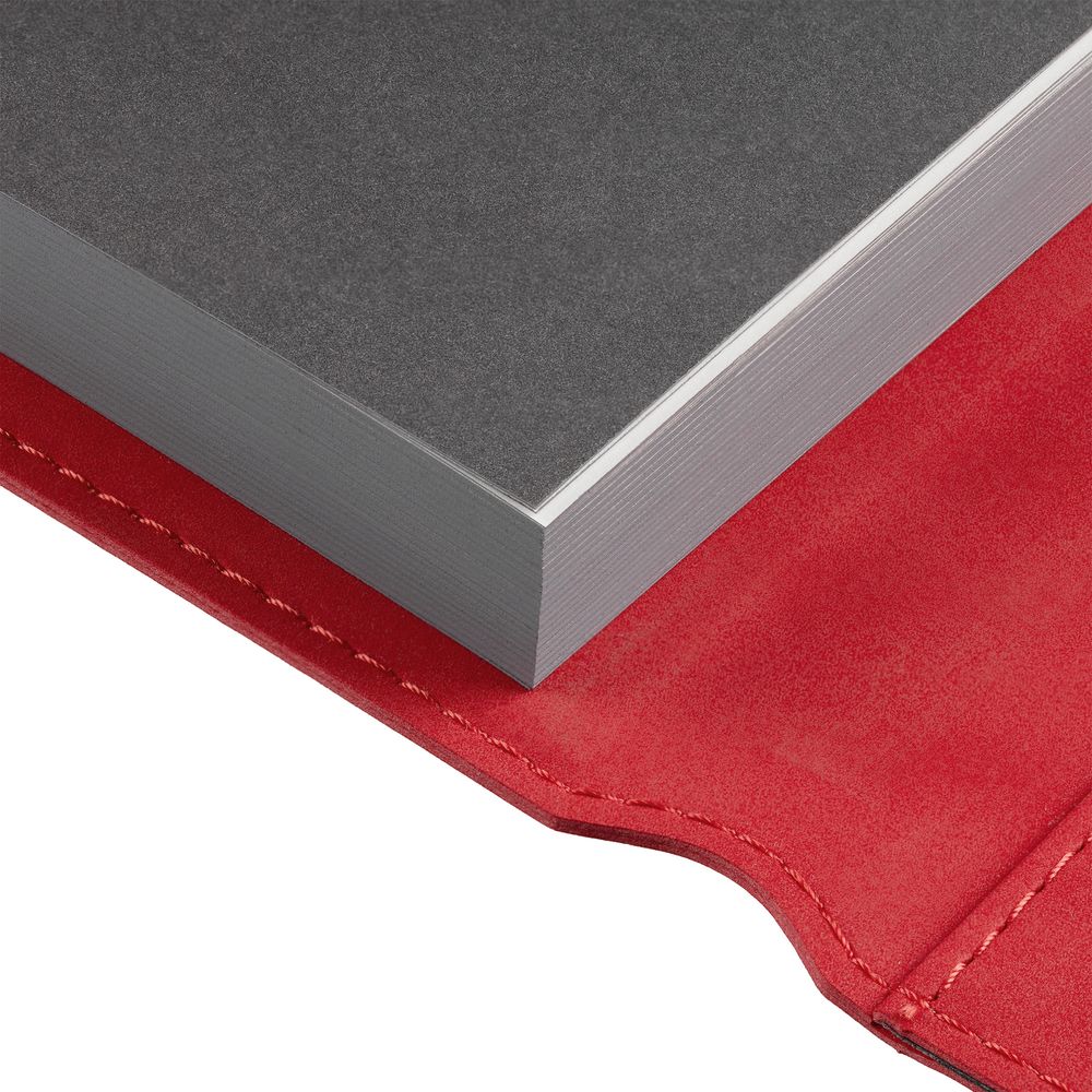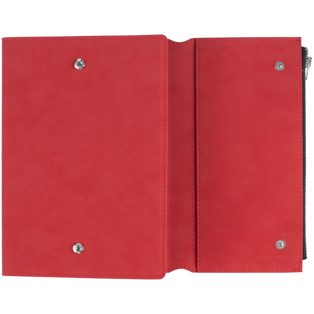 Ежедневник в гибкой суперобложке c карманом на молнии, выполнен из материала Nubuck, красный РР. Дополнен капталом и металлической шильдой на ляссе серого цвета.