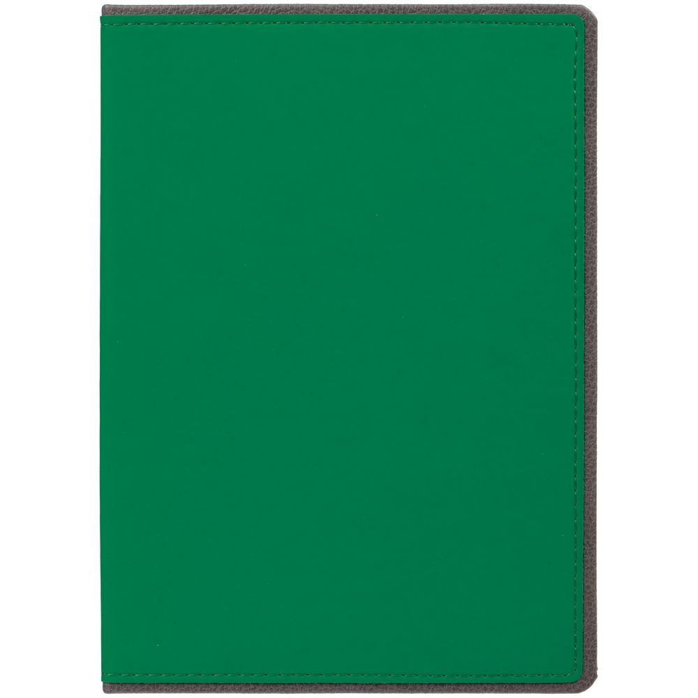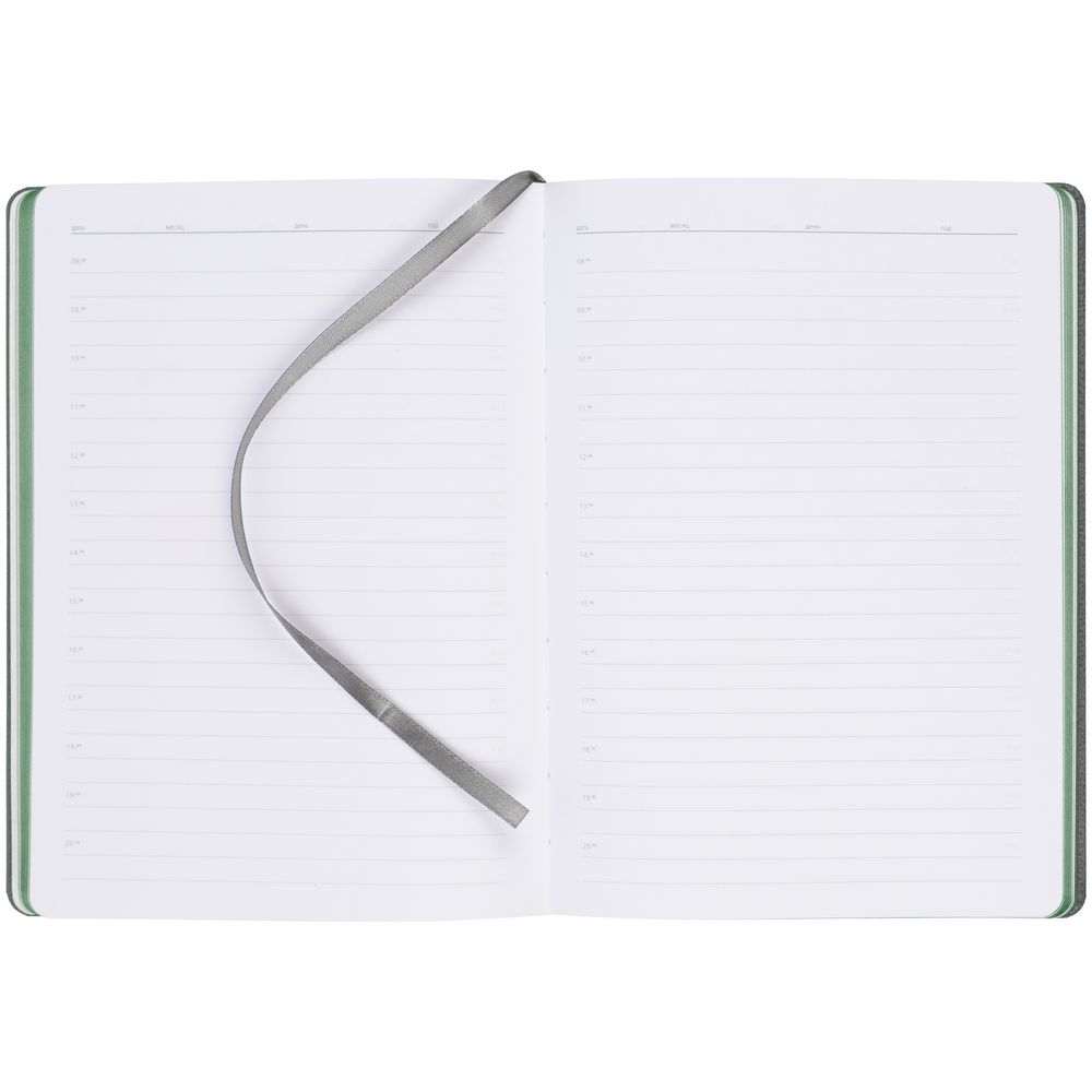 Ежедневник с твердой обложкой, выполнен из материалов Soft Touch Ultra, зеленый FF и La Fite, серый СС. Ляссе темно-серого цвета.