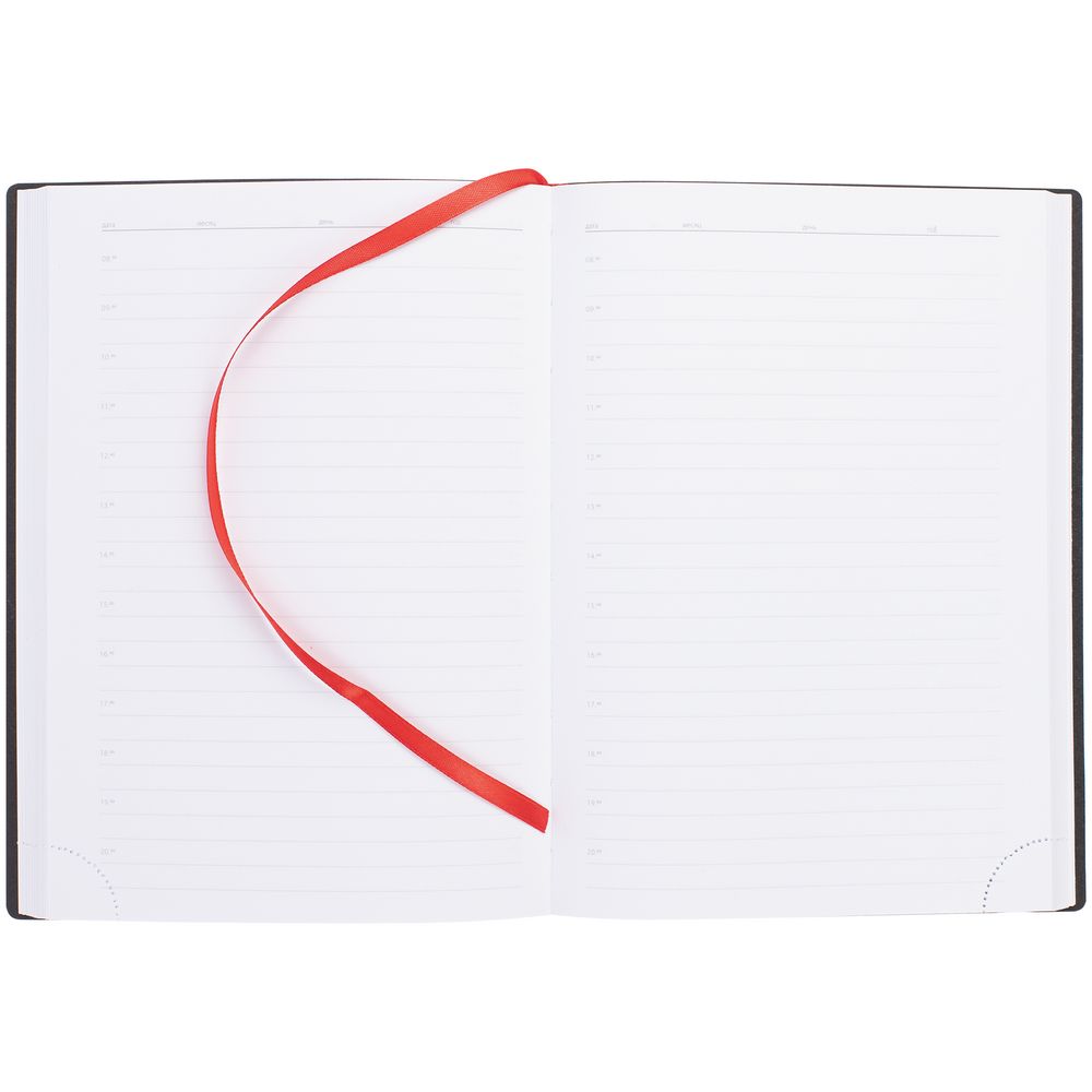 Ежедневник с гибкой обложкой, выполнен из материала Latte, красный PP, дополнен резинкой шириной 1 см с металлическим шильдом, капталом и ляссе красного цвета.