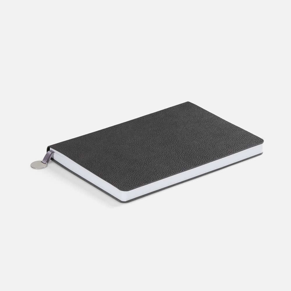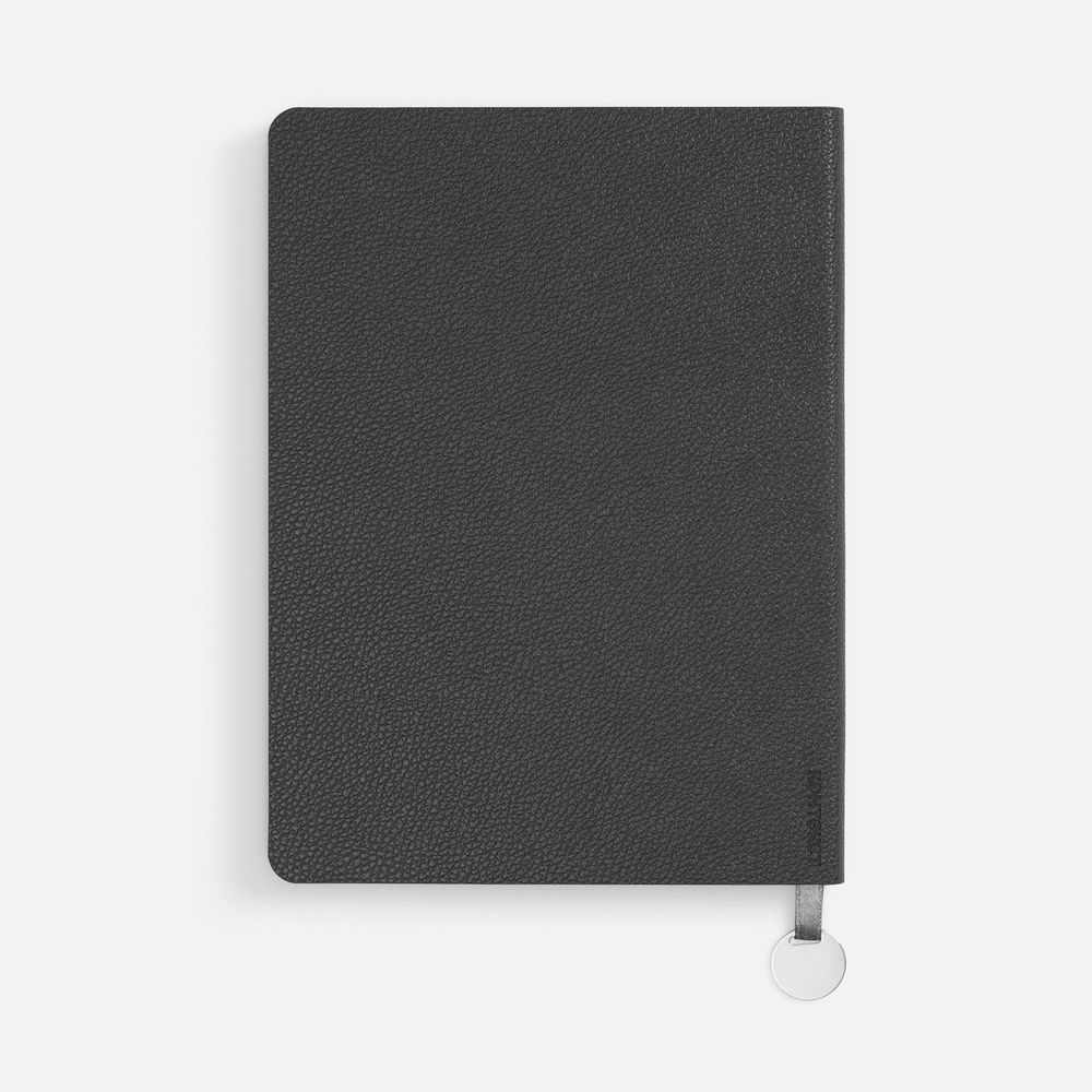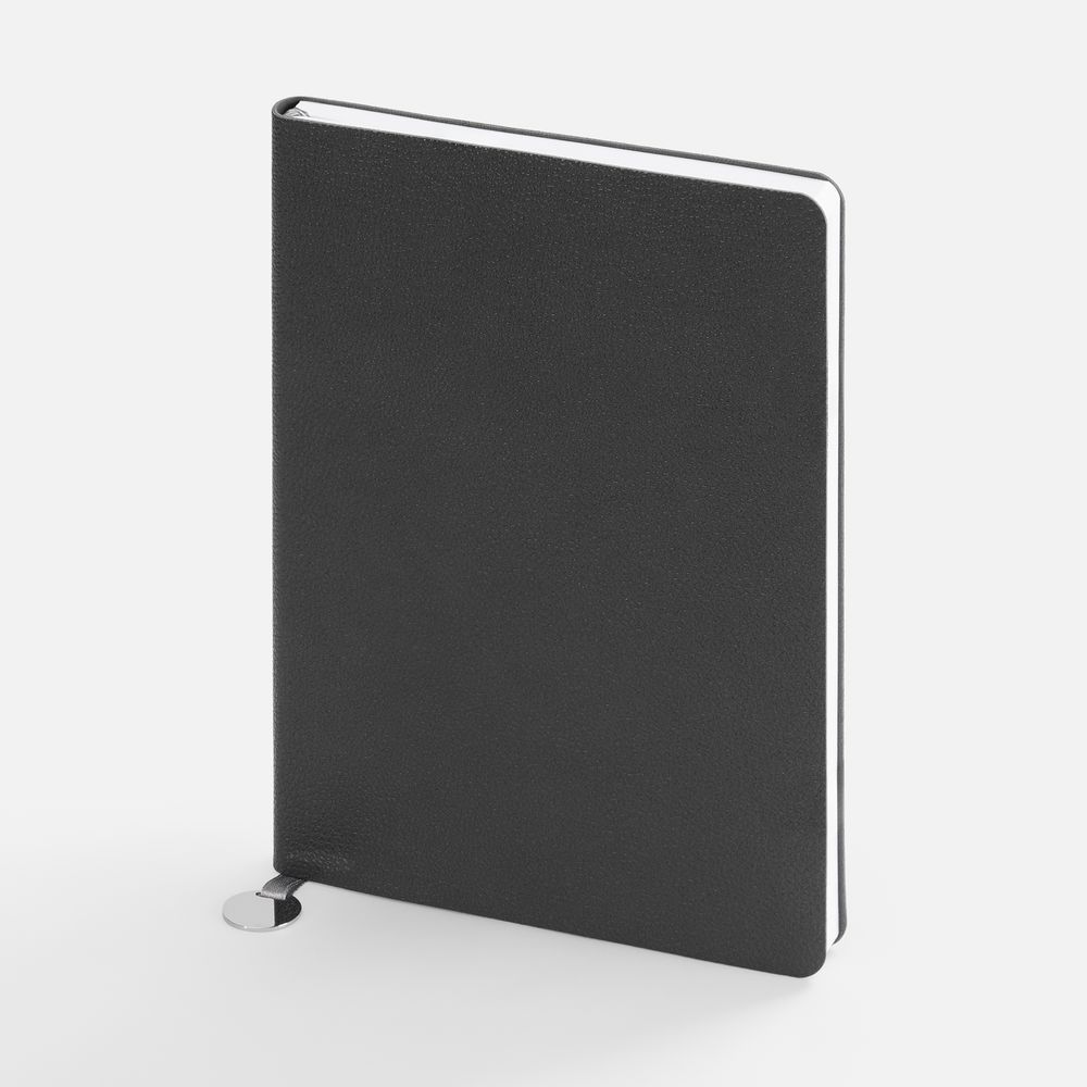 Ежедневник с гибкой обложкой, выполнен из материала La Fite, темно-серый ЕЕ, дополнен ляссе в цвет обложки с металлическим шильдом.