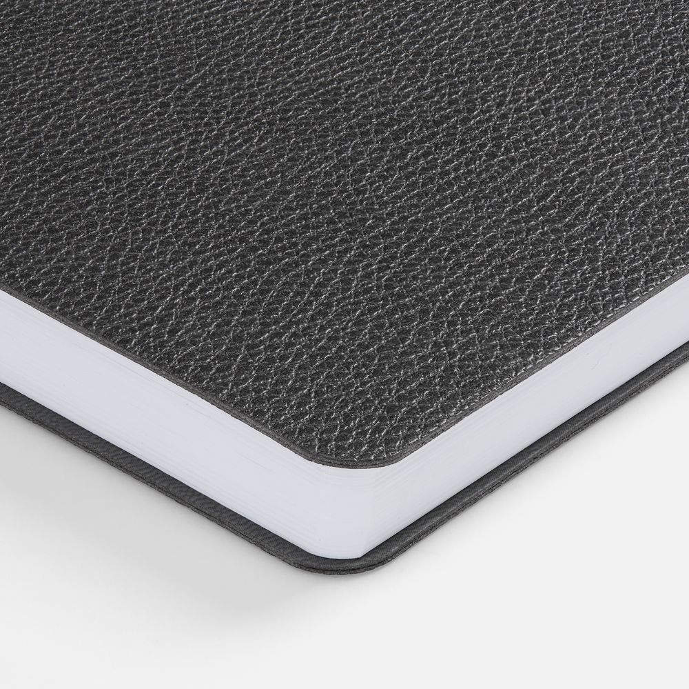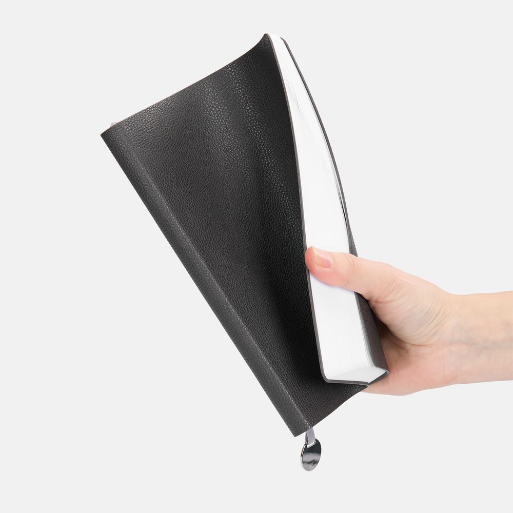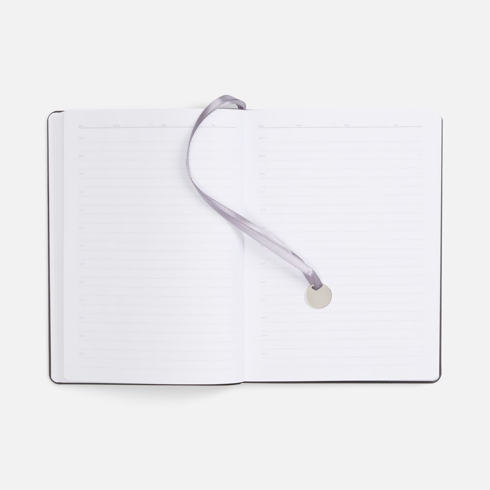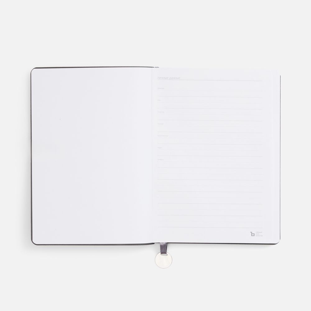Ежедневник с гибкой обложкой, выполнен из материала La Fite, темно-серый ЕЕ, дополнен ляссе в цвет обложки с металлическим шильдом.
