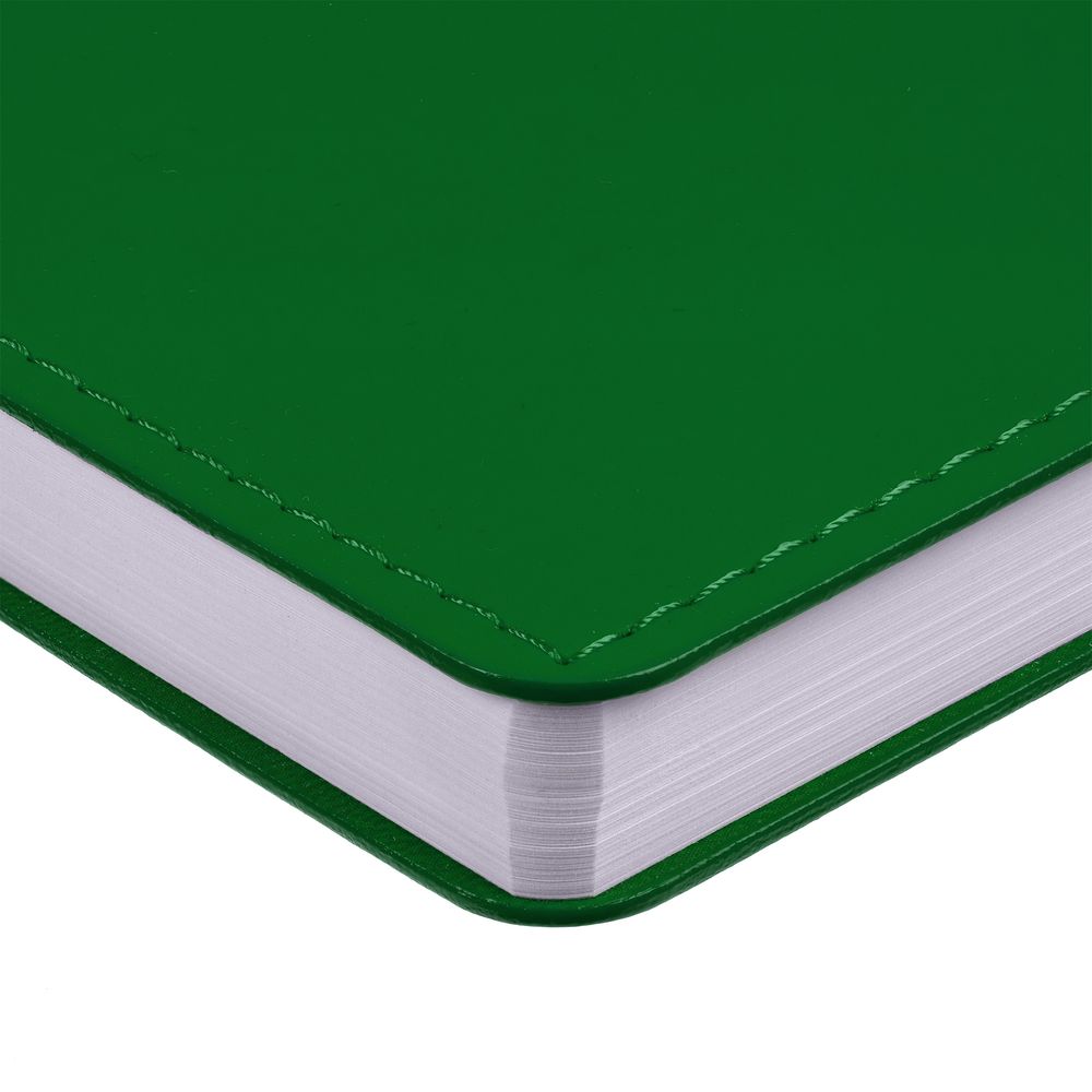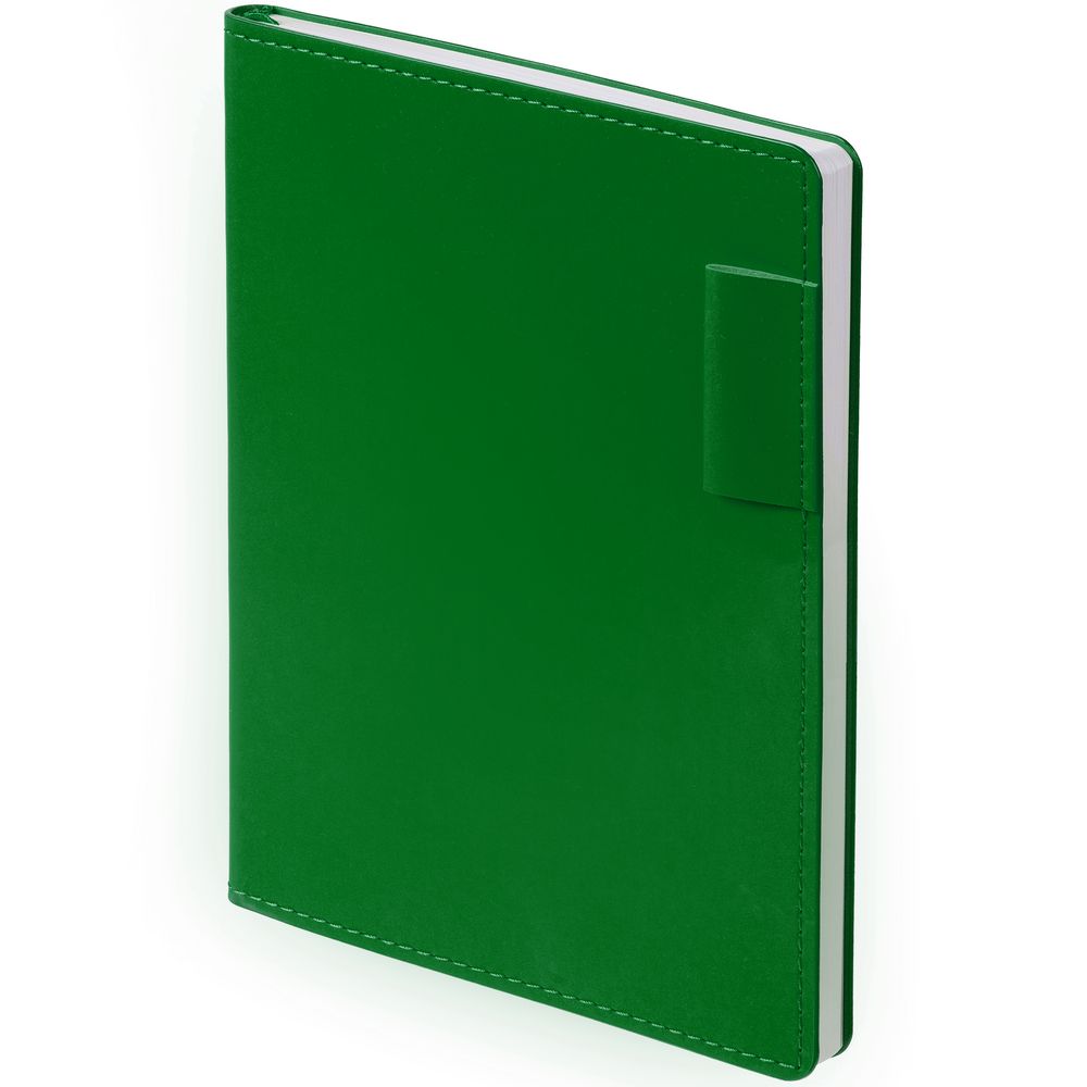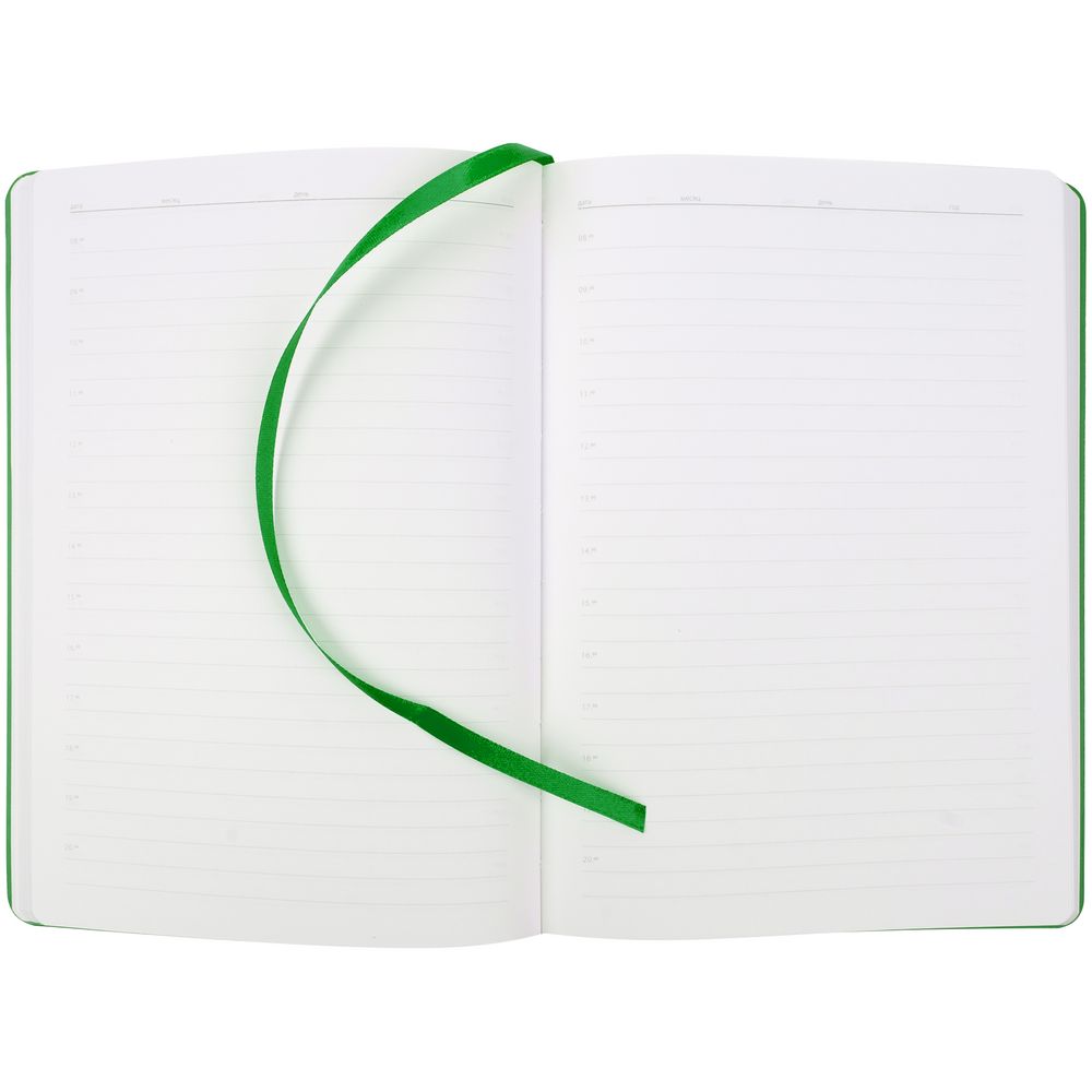 Ежедневник с гибкой обложкой из материала Soft Touch Ultra, зеленый FF и Latte, зеленый FF (внутренний материал), дополнен петелькой для ручки из покровного материала, капталом, ляссе и закрашенным срезом обложки в цвет материала.