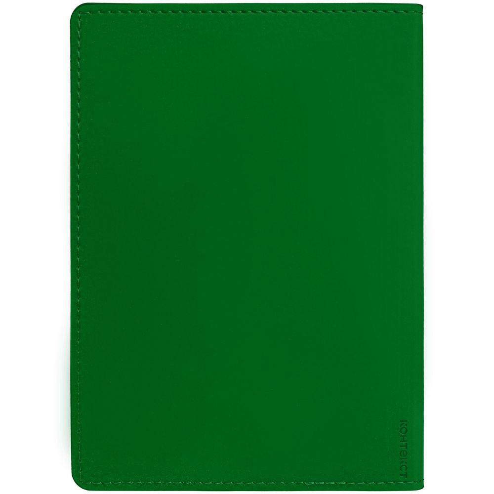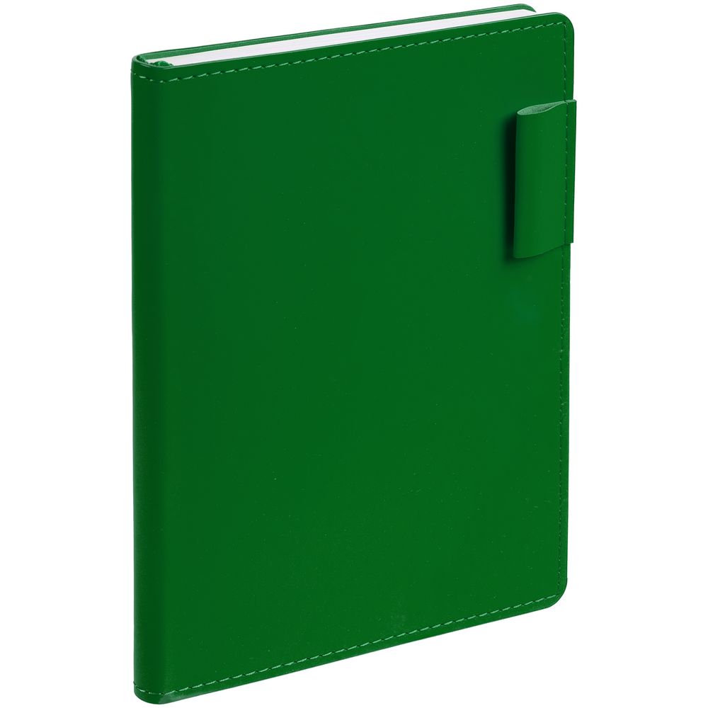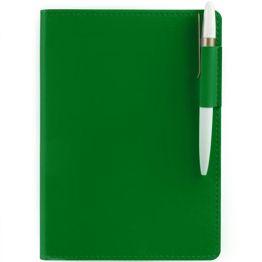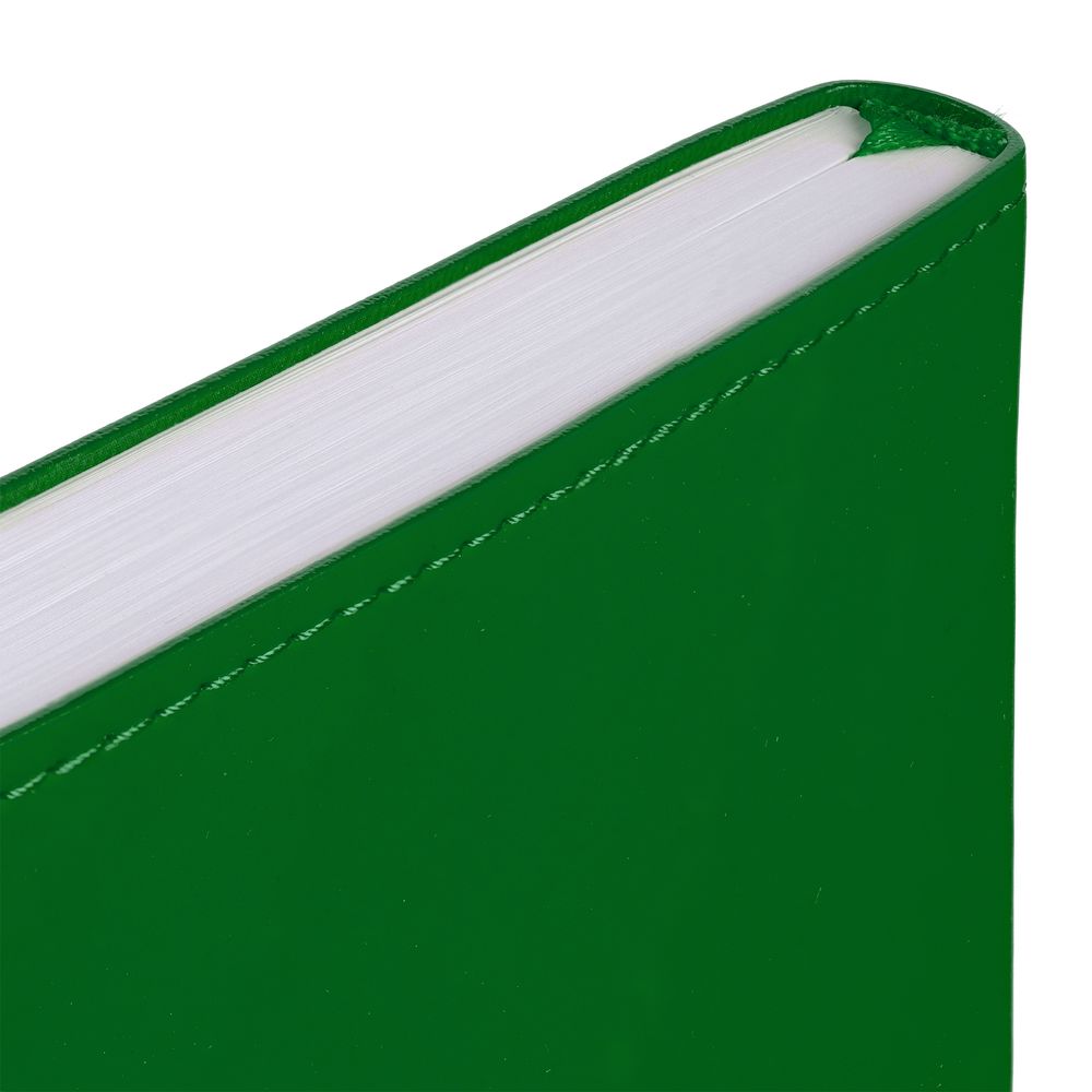 Ежедневник с гибкой обложкой из материала Soft Touch Ultra, зеленый FF и Latte, зеленый FF (внутренний материал), дополнен петелькой для ручки из покровного материала, капталом, ляссе и закрашенным срезом обложки в цвет материала.