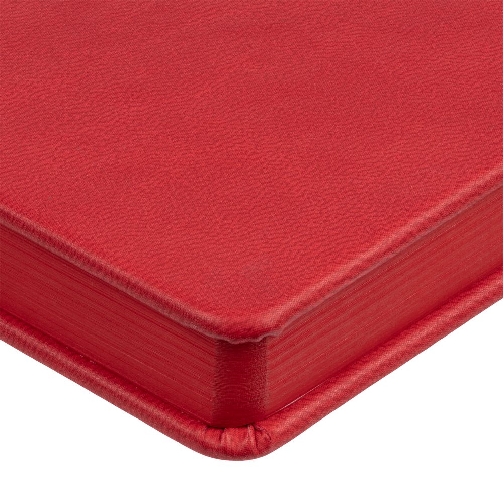 Ежедневник с твердой обложкой и тонированным обрезом. Выполнен из материала Latte, красный, дополнен ляссе в цвет обложки.