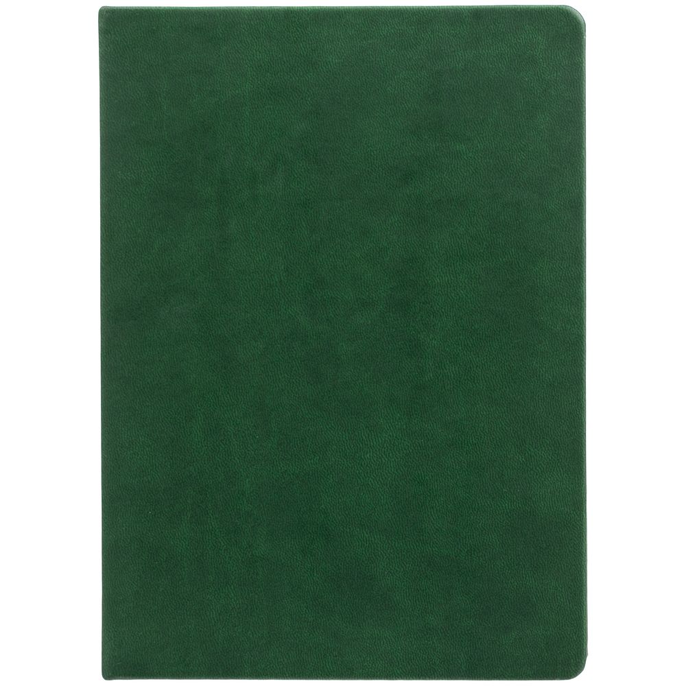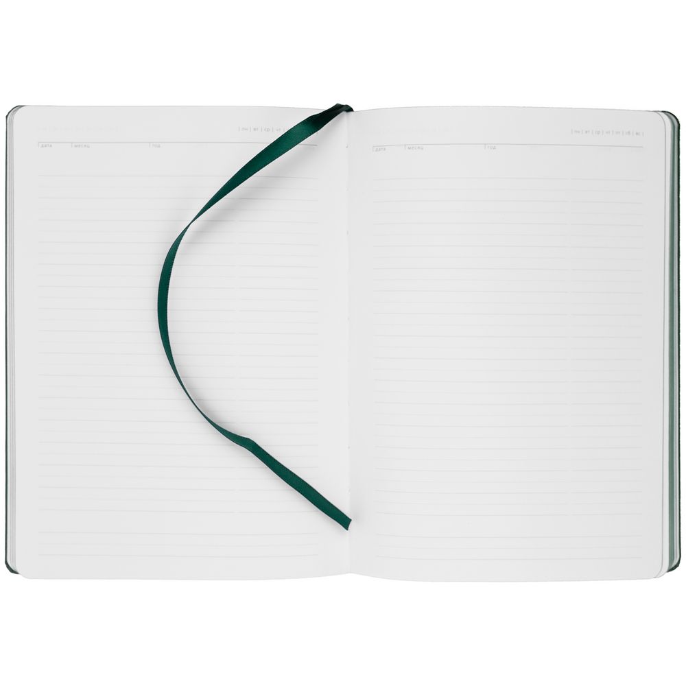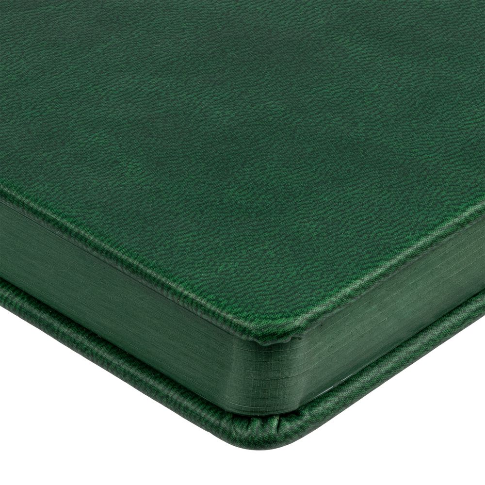 Ежедневник с твердой обложкой и тонированным обрезом. Выполнен из материала Latte, зеленый, дополнен ляссе в цвет обложки.