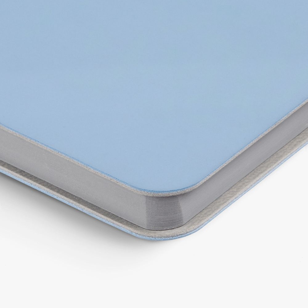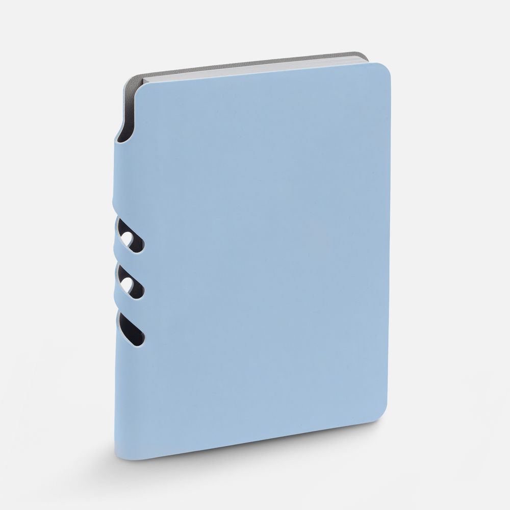 Ежедневник с гибкой обложкой выполнен из материала Soft Touch, голубой JJ и серого Latte (внутренняя часть обложки).