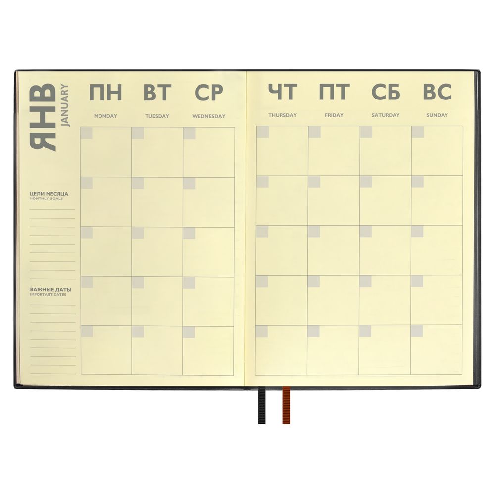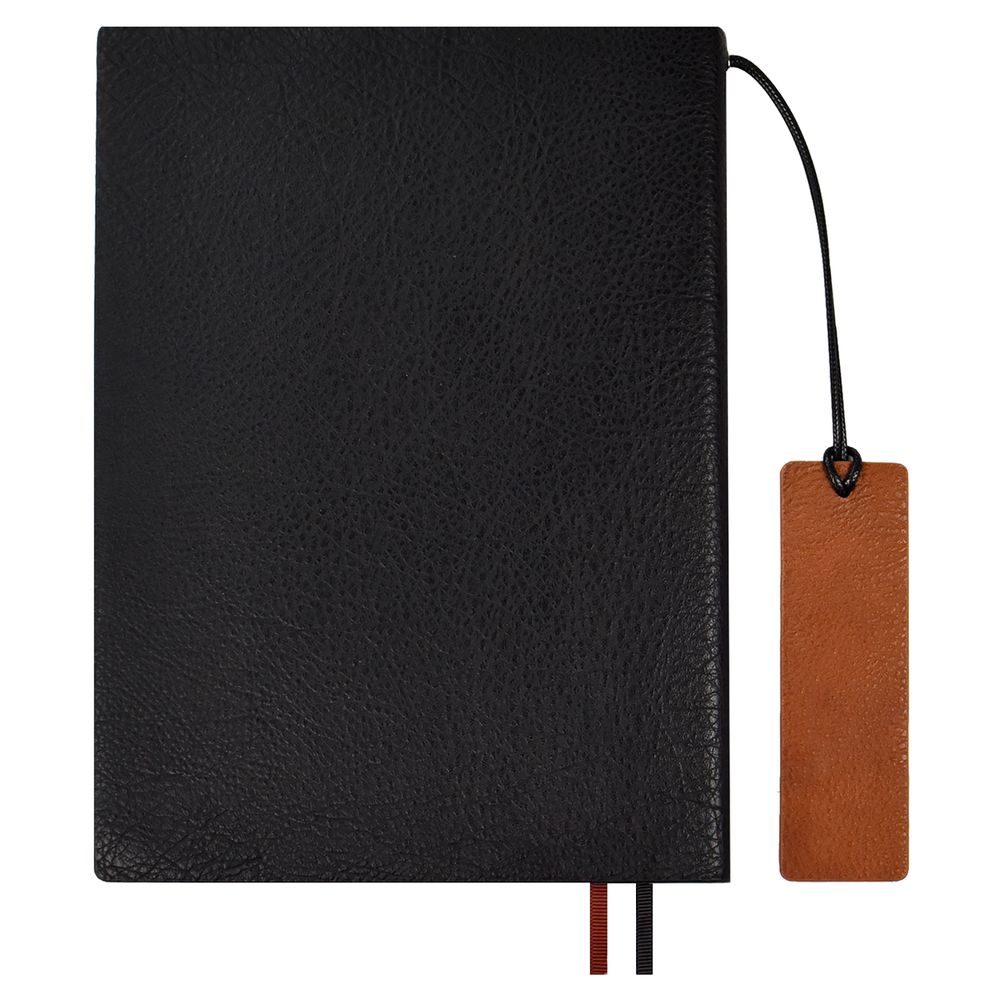Ежедневник с гибкой обложкой и закладкой из искусственной кожи, дополнен капталом и двойным ляссе.