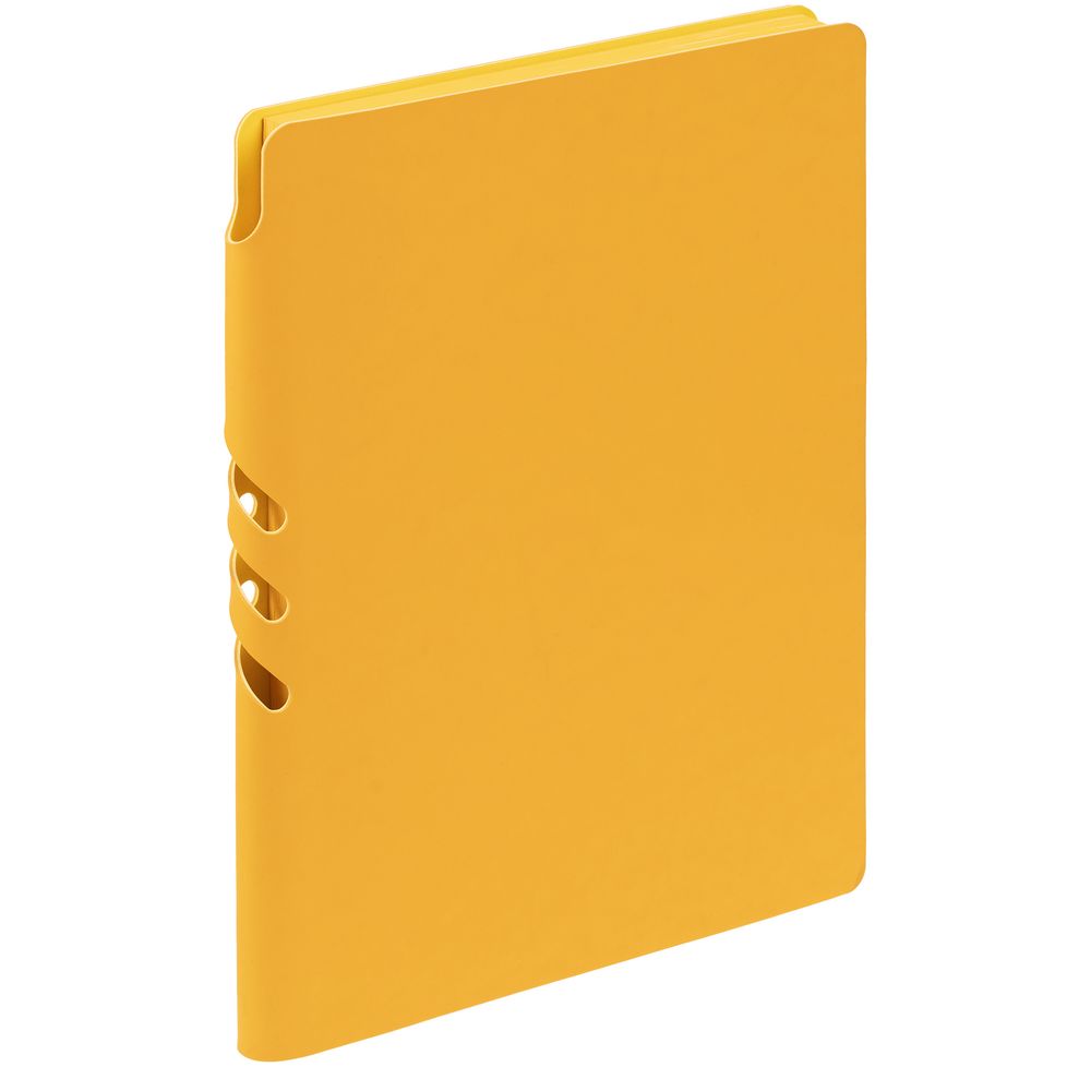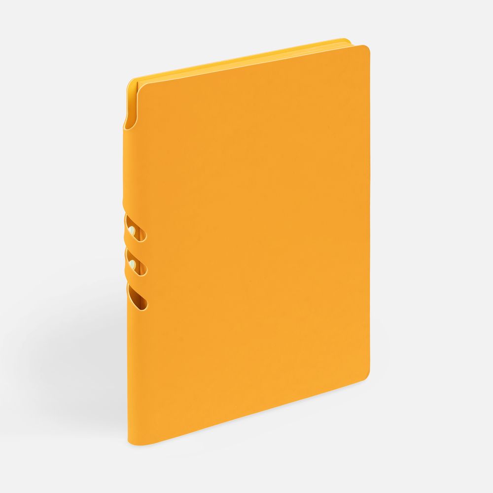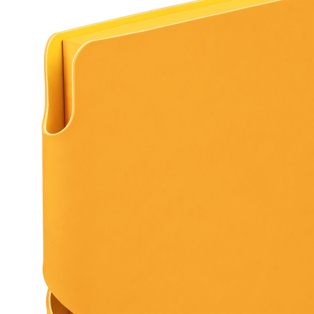 Гибкая обложка выполнена из материала Soft Touch, желтый КК и Latte, желтый КК (внутренняя часть обложки). Внутри корешка — специальное место для крепления ручки размером до 15х1 см.