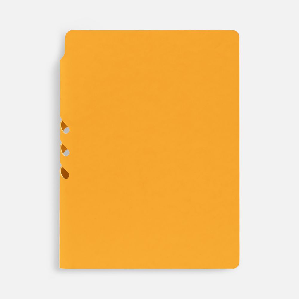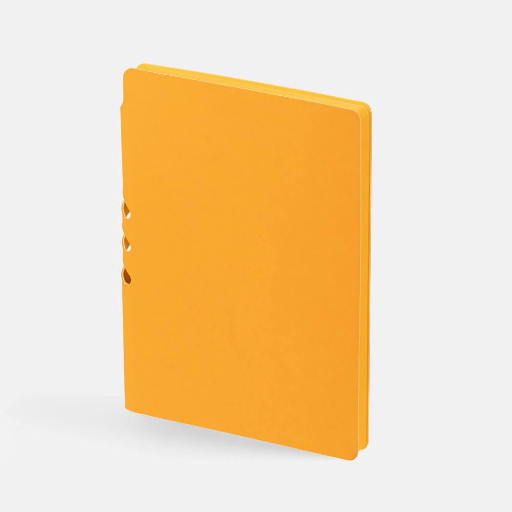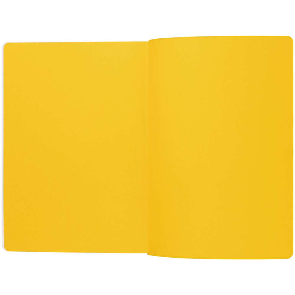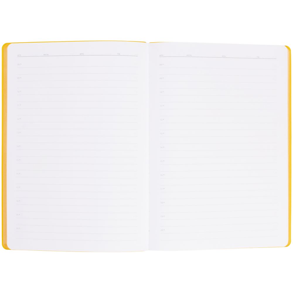 Гибкая обложка выполнена из материала Soft Touch, желтый КК и Latte, желтый КК (внутренняя часть обложки). Внутри корешка — специальное место для крепления ручки размером до 15х1 см.