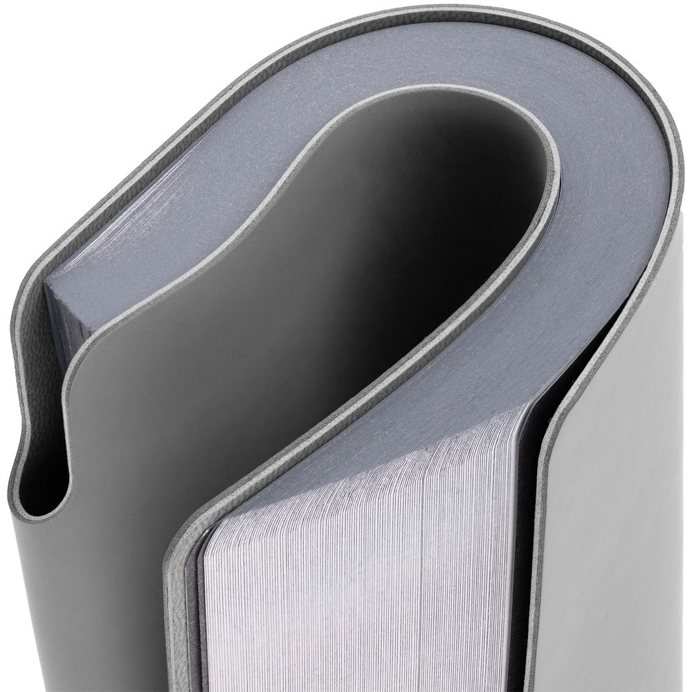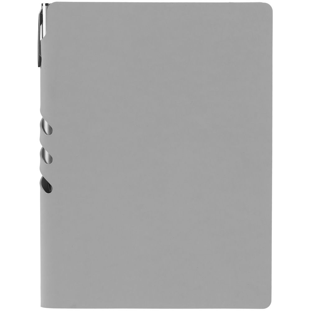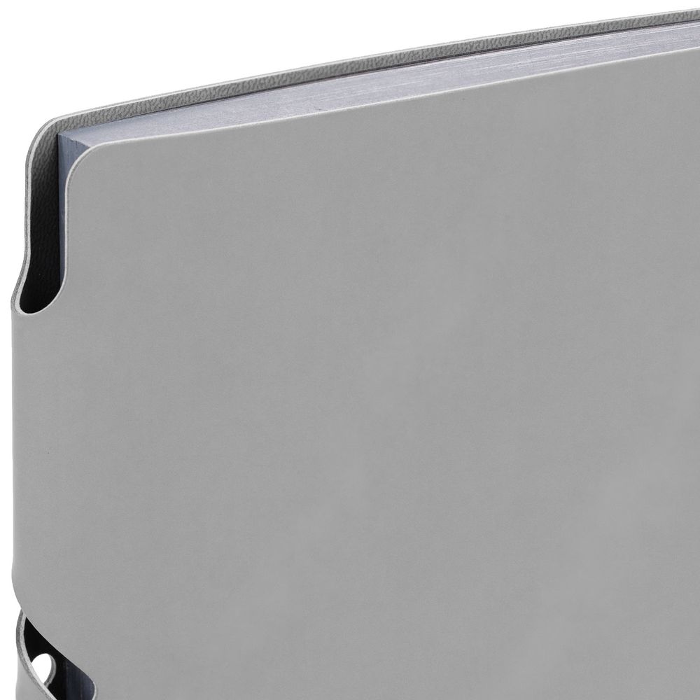 Гибкая обложка выполнена из материала Soft Touch, серый СС и Latte, серый СС (внутренняя часть обложки). Внутри корешка — специальное место для крепления ручки размером до 15х1 см.