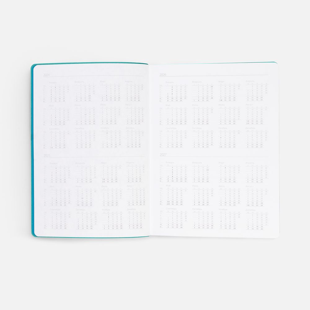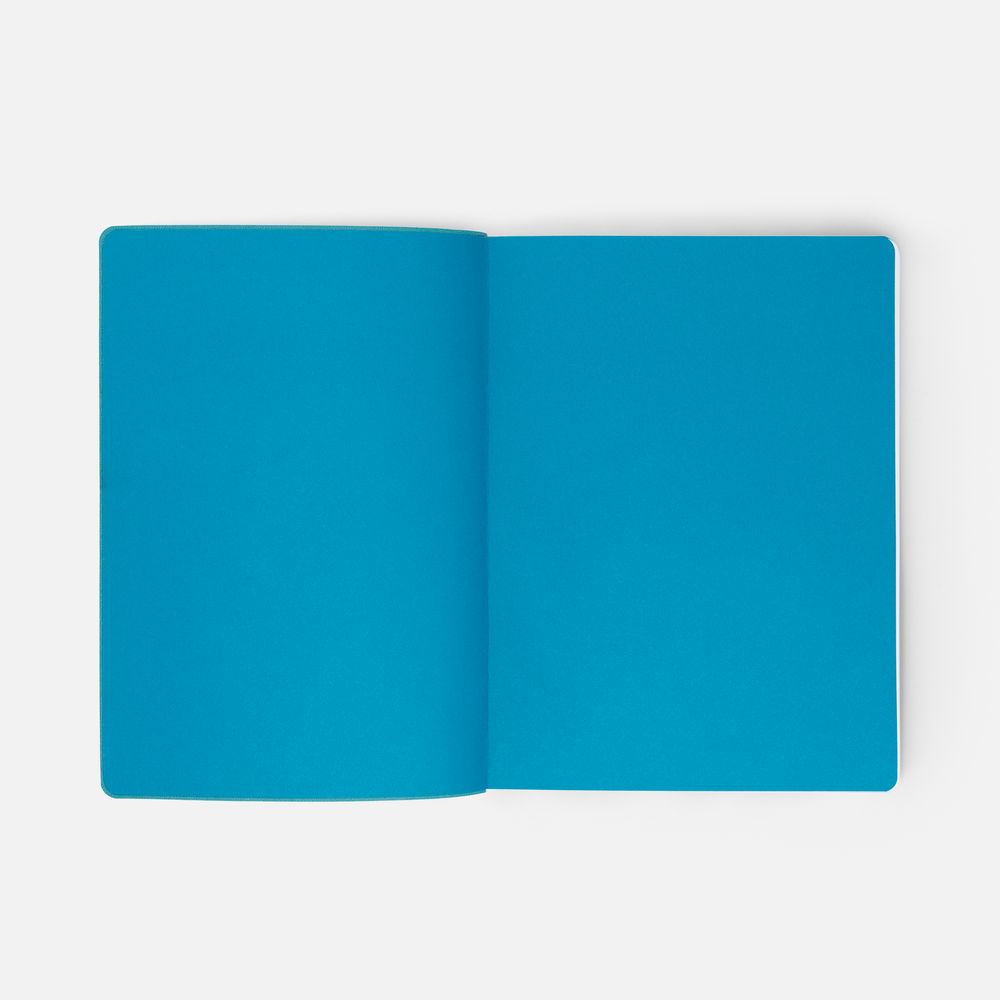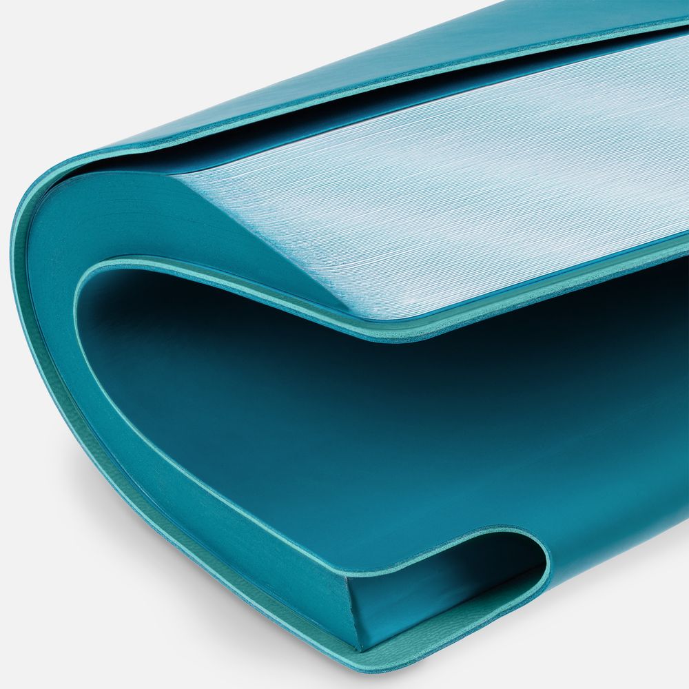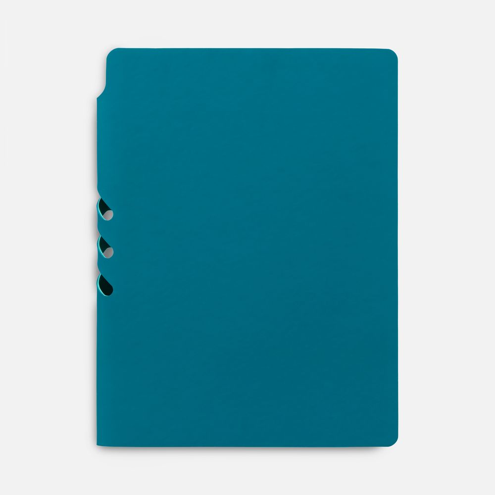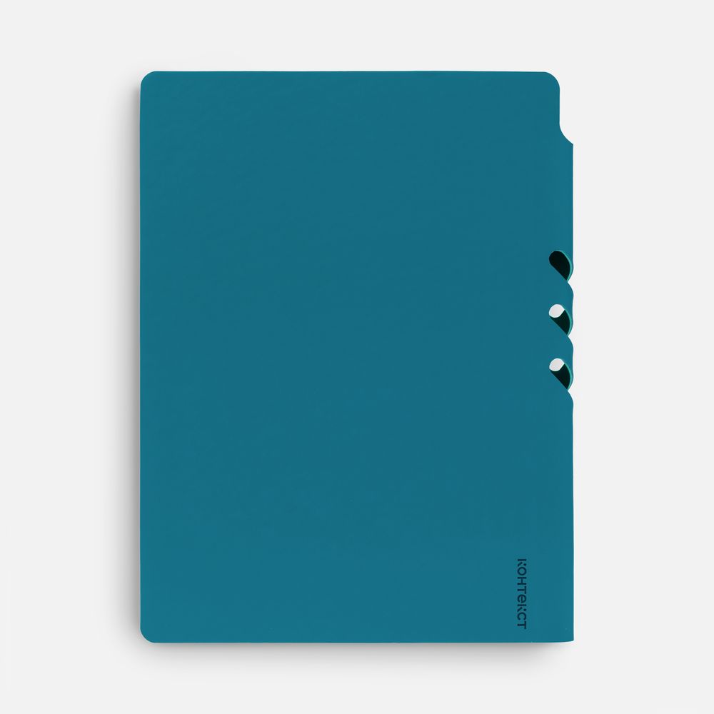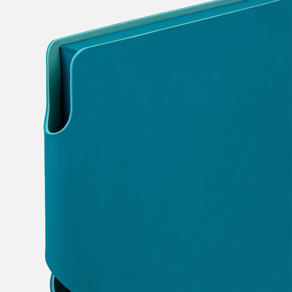 Гибкая обложка выполнена из материала Soft Touch, цвет морской волны II и Latte, цвет морской волны II (внутренняя часть обложки). Внутри корешка — специальное место для крепления ручки размером до 15х1 см.