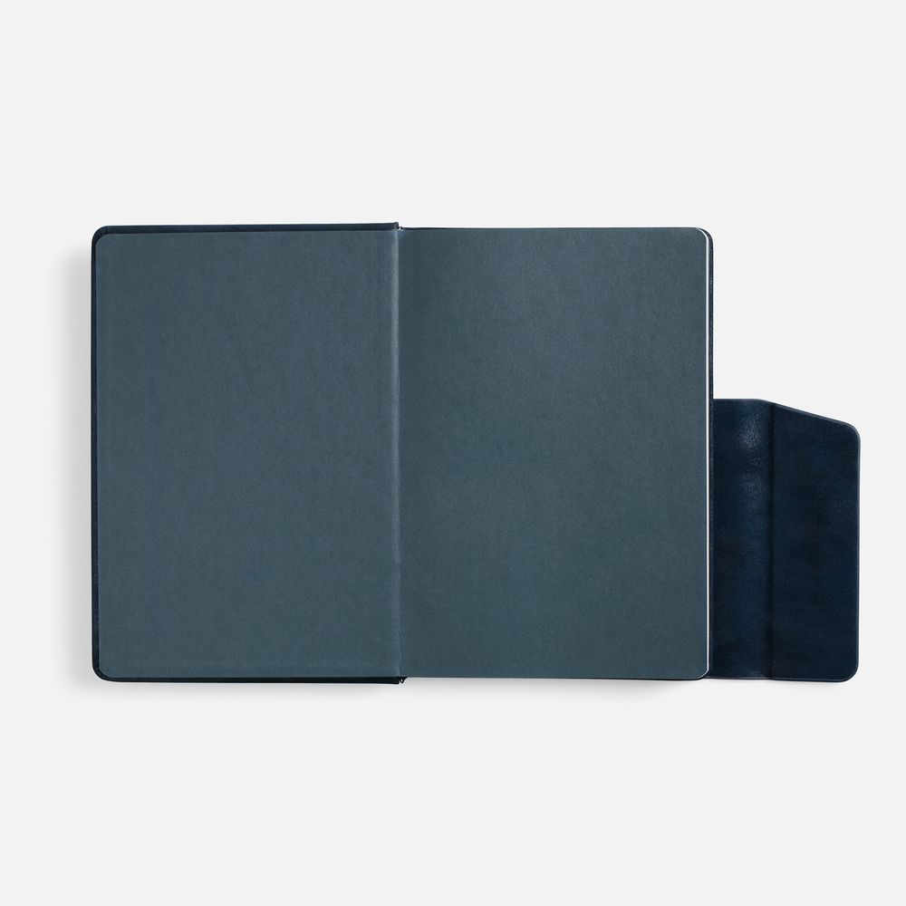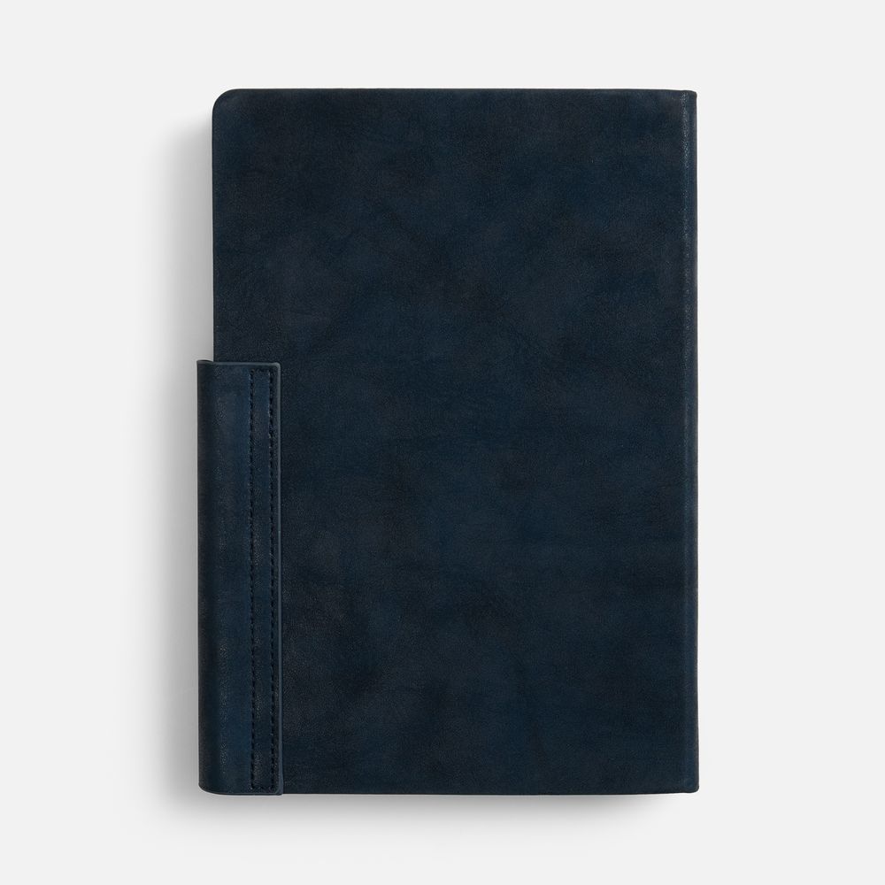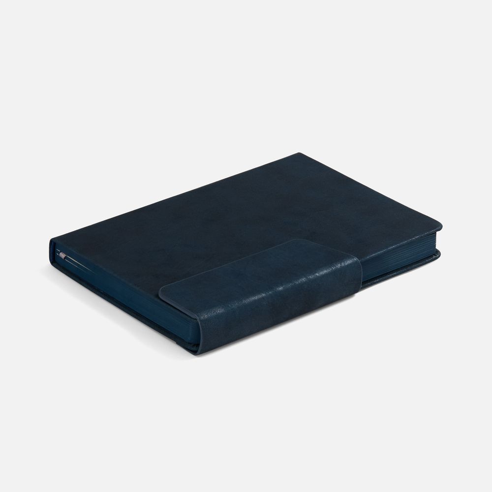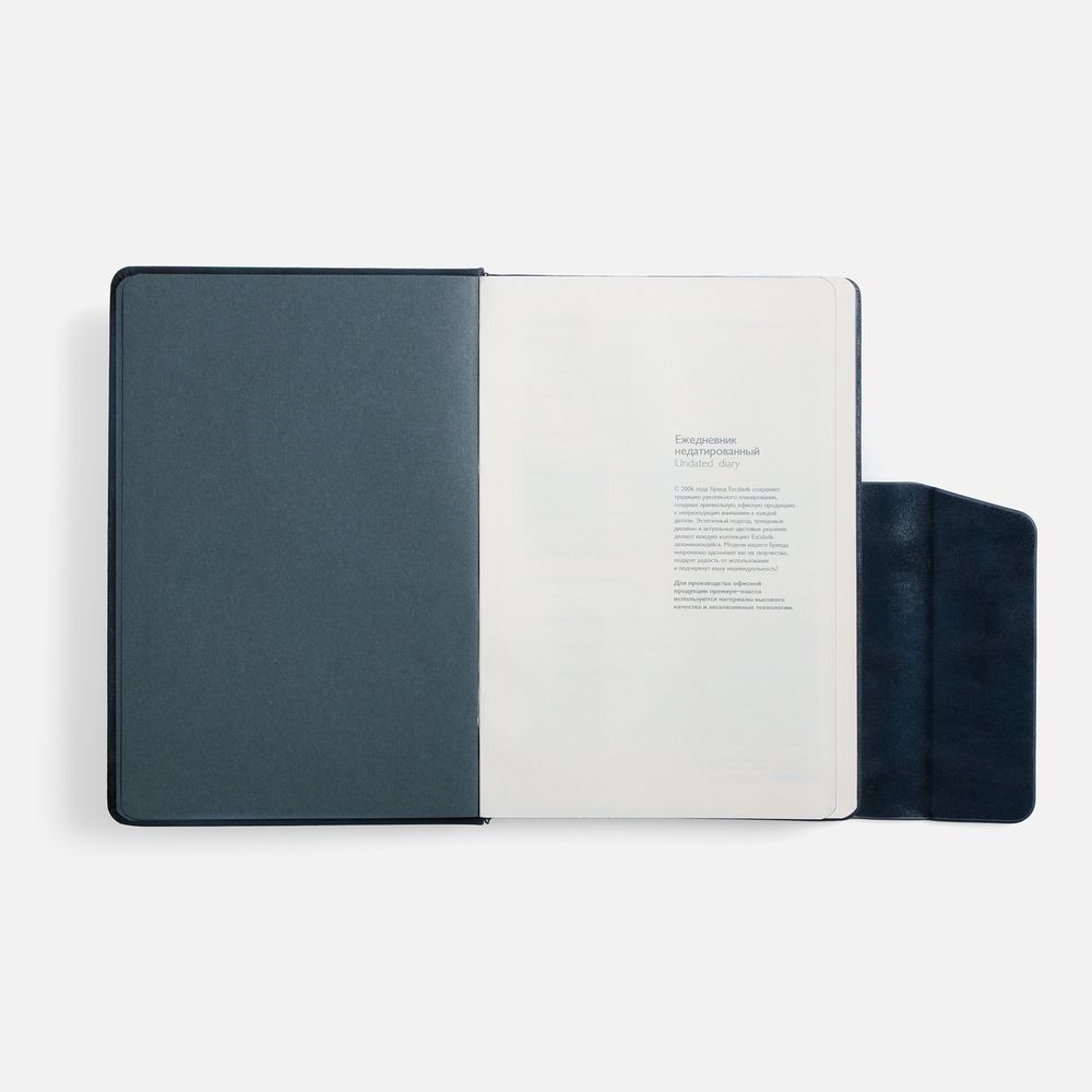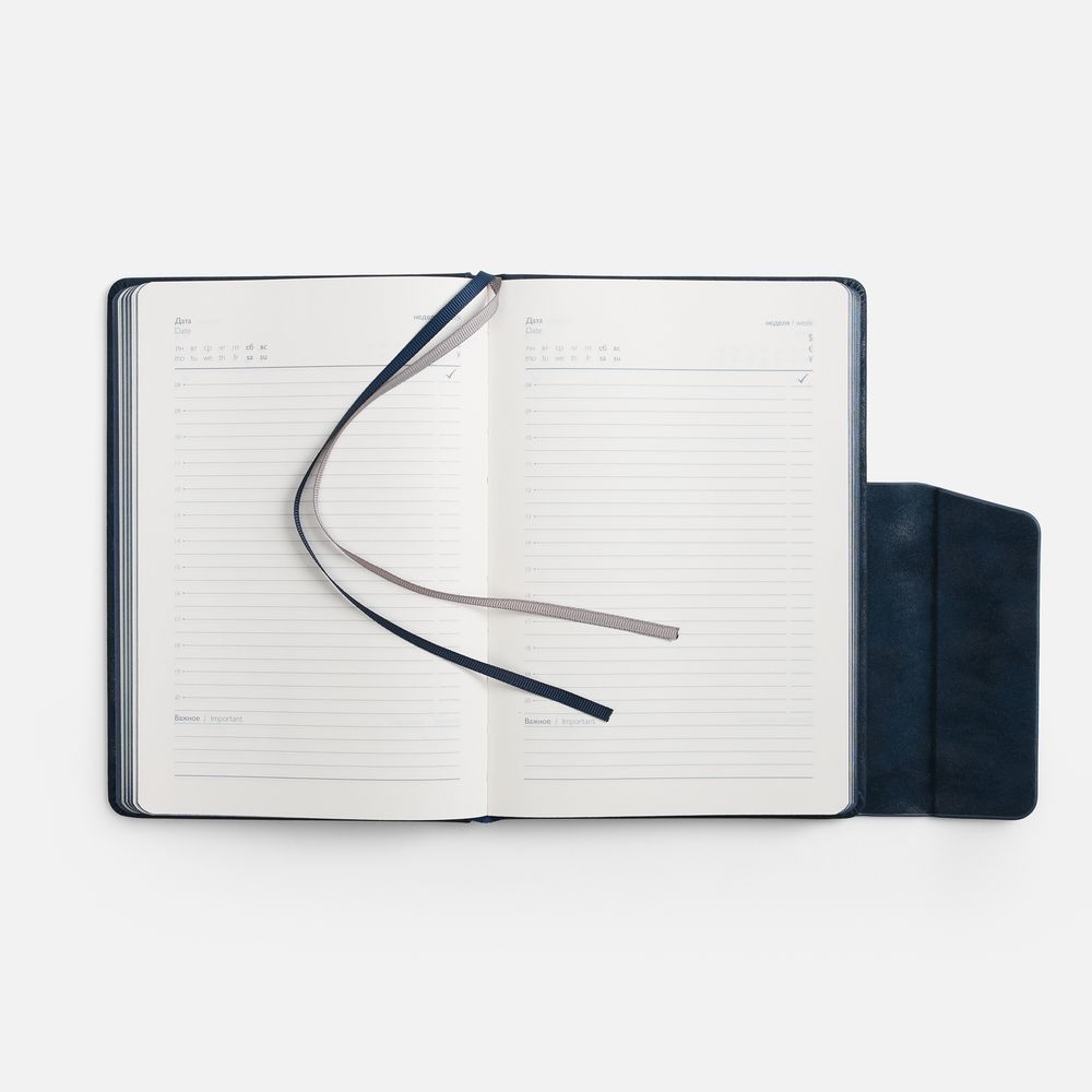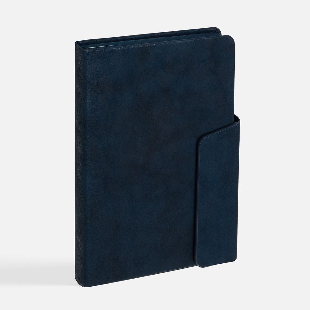 Ежедневник с твердой обложкой и фигурным магнитным клапаном, дополнен капталом и двойным ляссе.