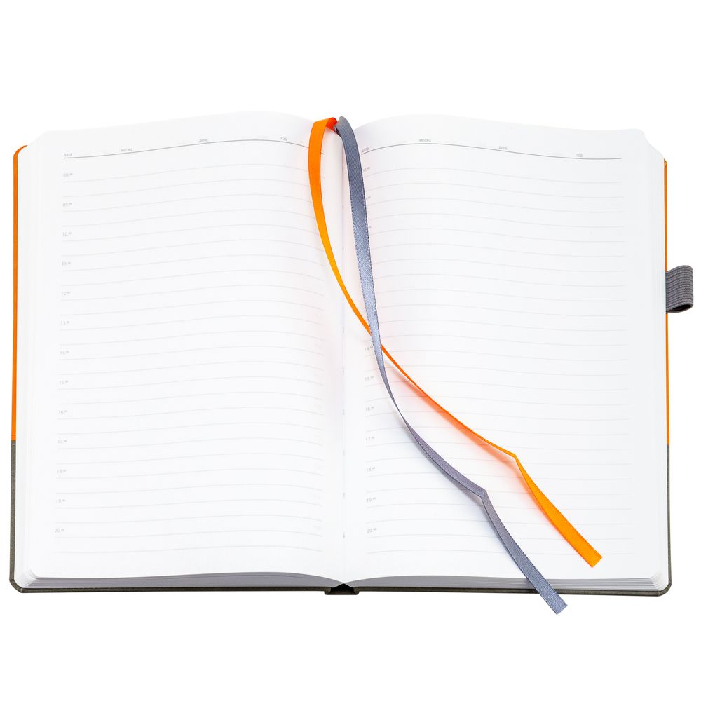 Ежедневник с твердой обложкой, без поролона, со сшивкой материалов Nubuck Touch, серый СС, и Nubuck Touch оранжевый ОО, дополнен двойным ляссе и петлей-резинкой для ручки.