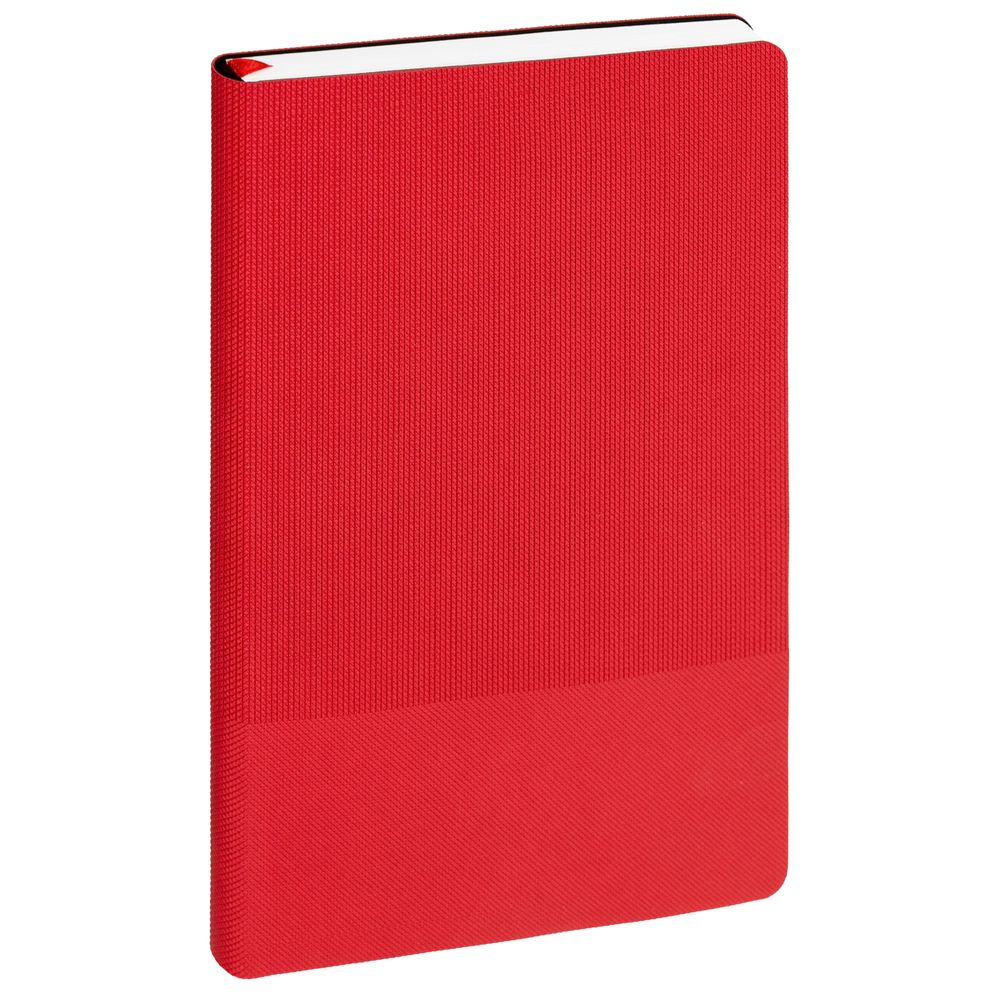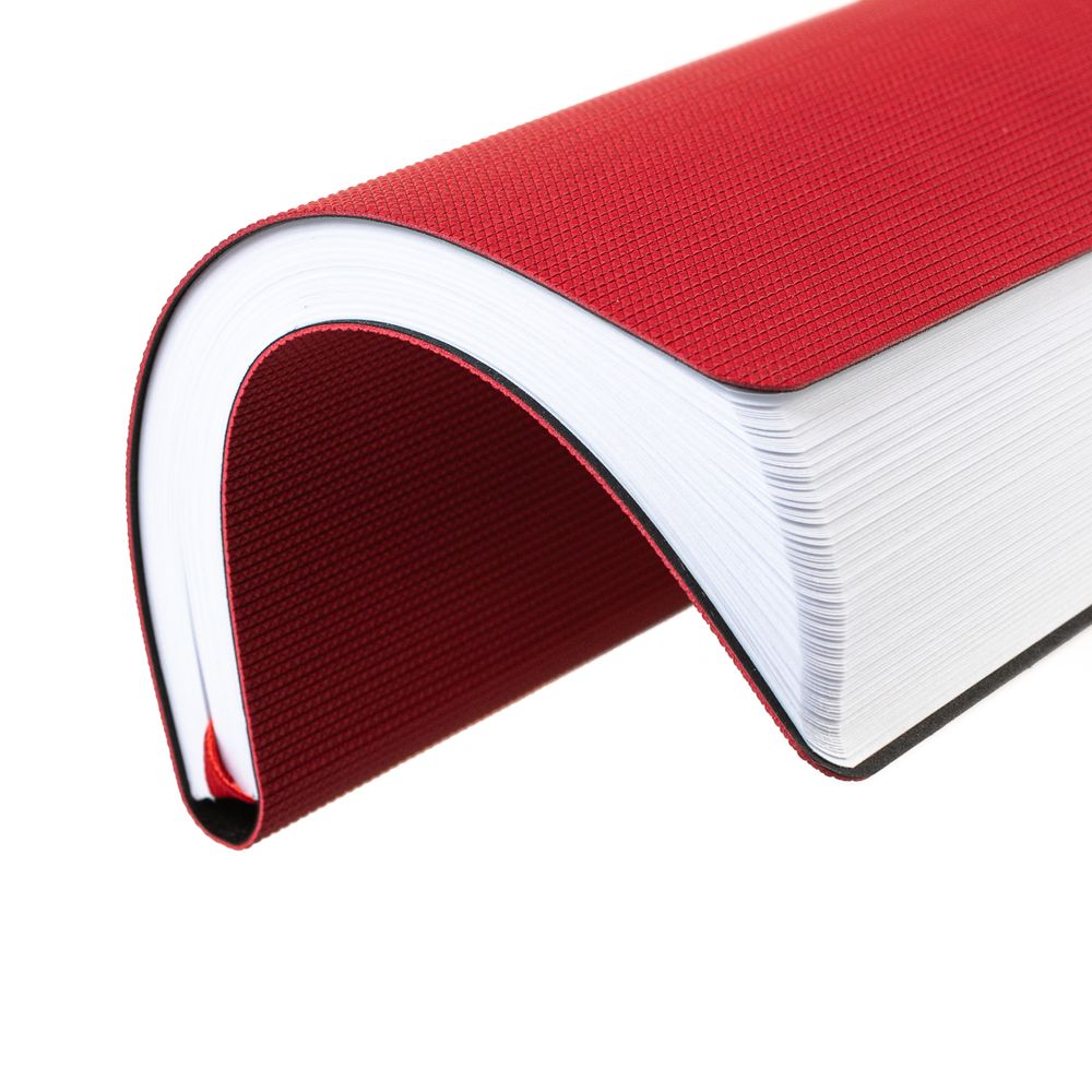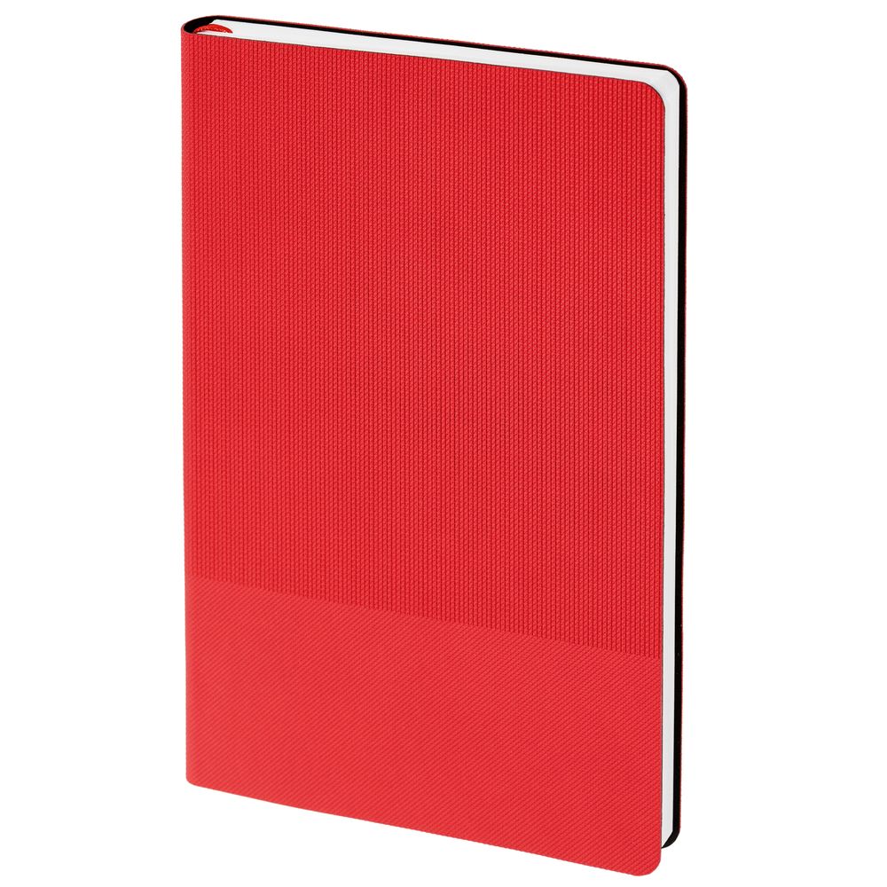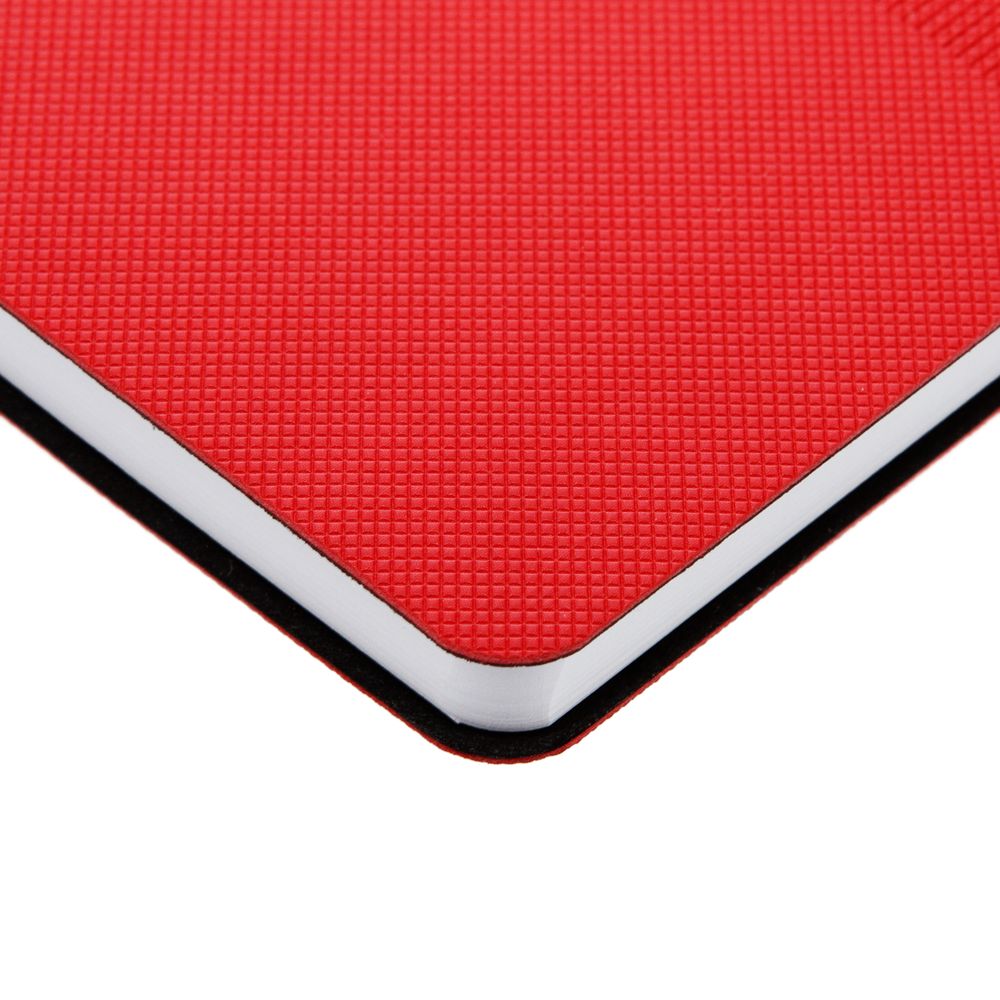 Ежедневник с гибкой обложкой, выполнен из материала Canyon, красный РР, дополнен ляссе в цвет обложки. Блинтовое тиснение на обложке создает эффект вязаного полотна.