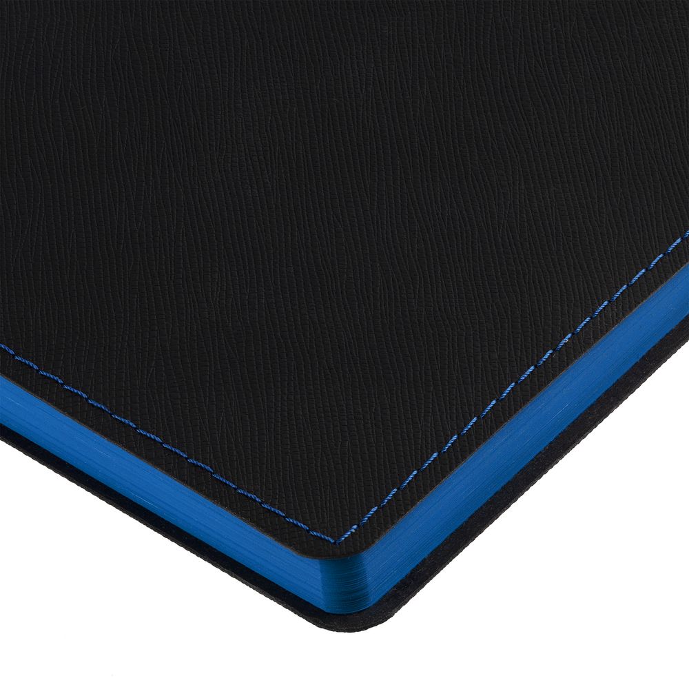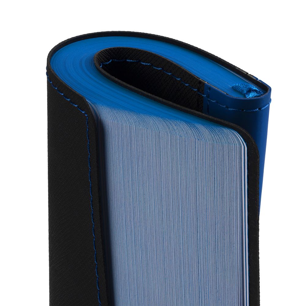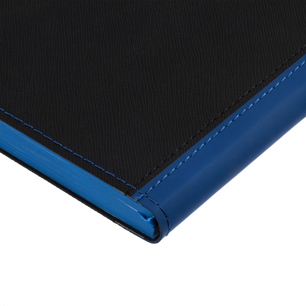 Ежедневник с гибкой обложкой выполнен из материала Nice Touch, черный АА и Soft Touch Ultra, синий НН, дополнен ляссе гсинего цвета.
