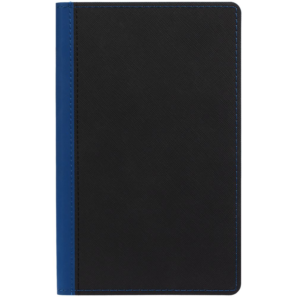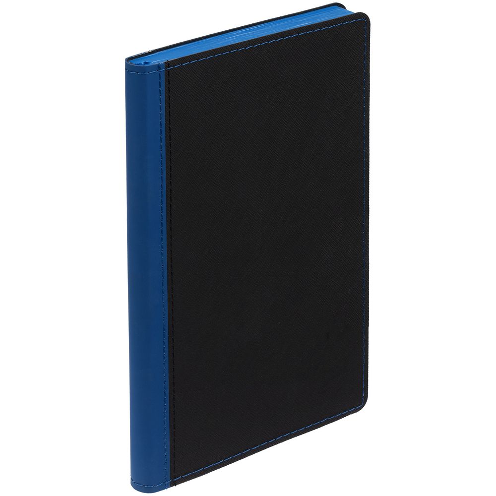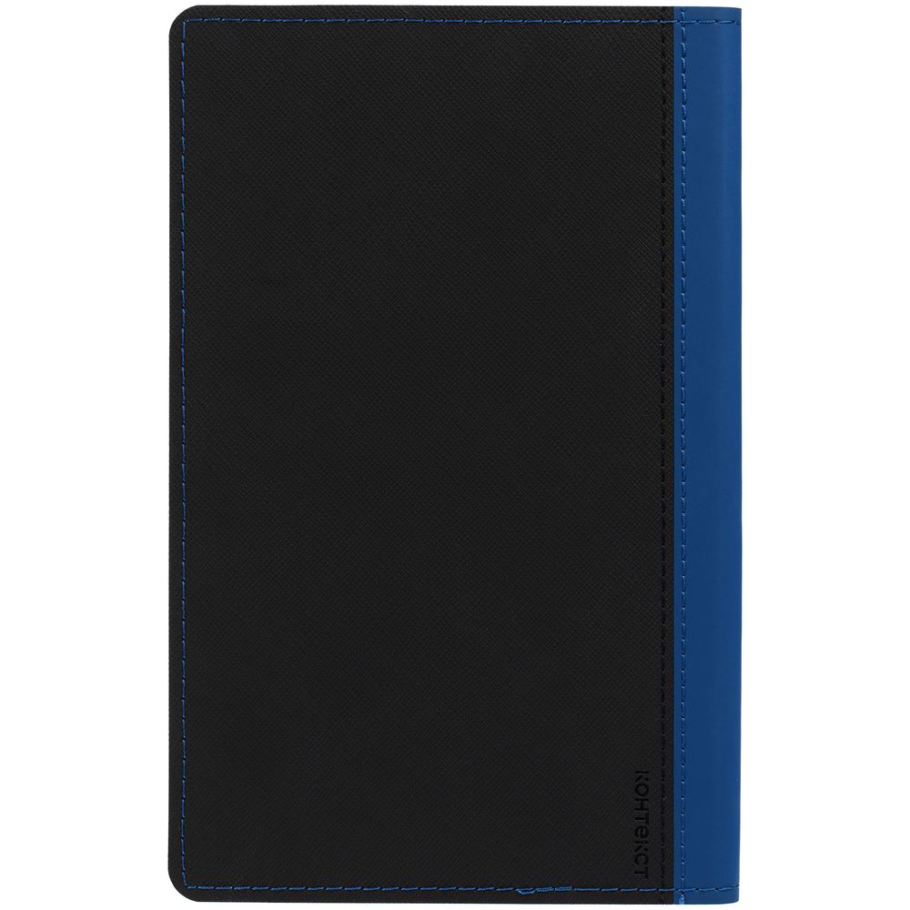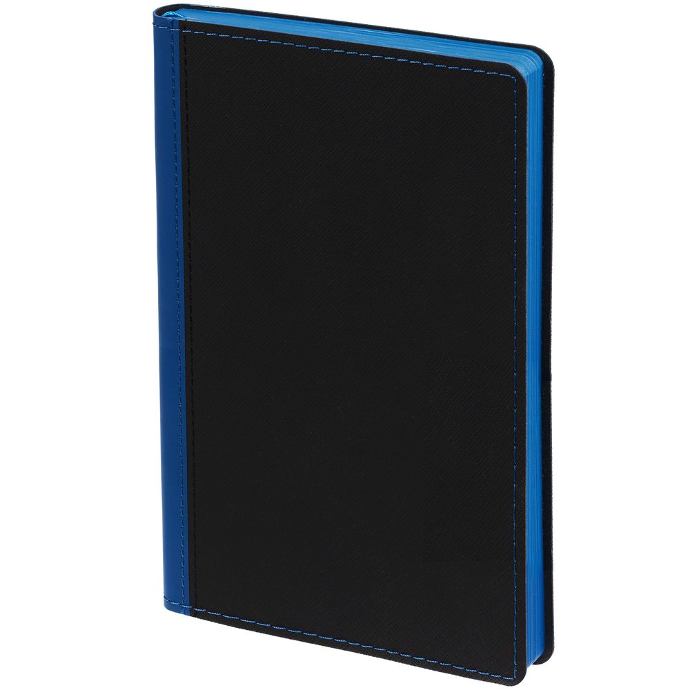 Ежедневник с гибкой обложкой выполнен из материала Nice Touch, черный АА и Soft Touch Ultra, синий НН, дополнен ляссе гсинего цвета.