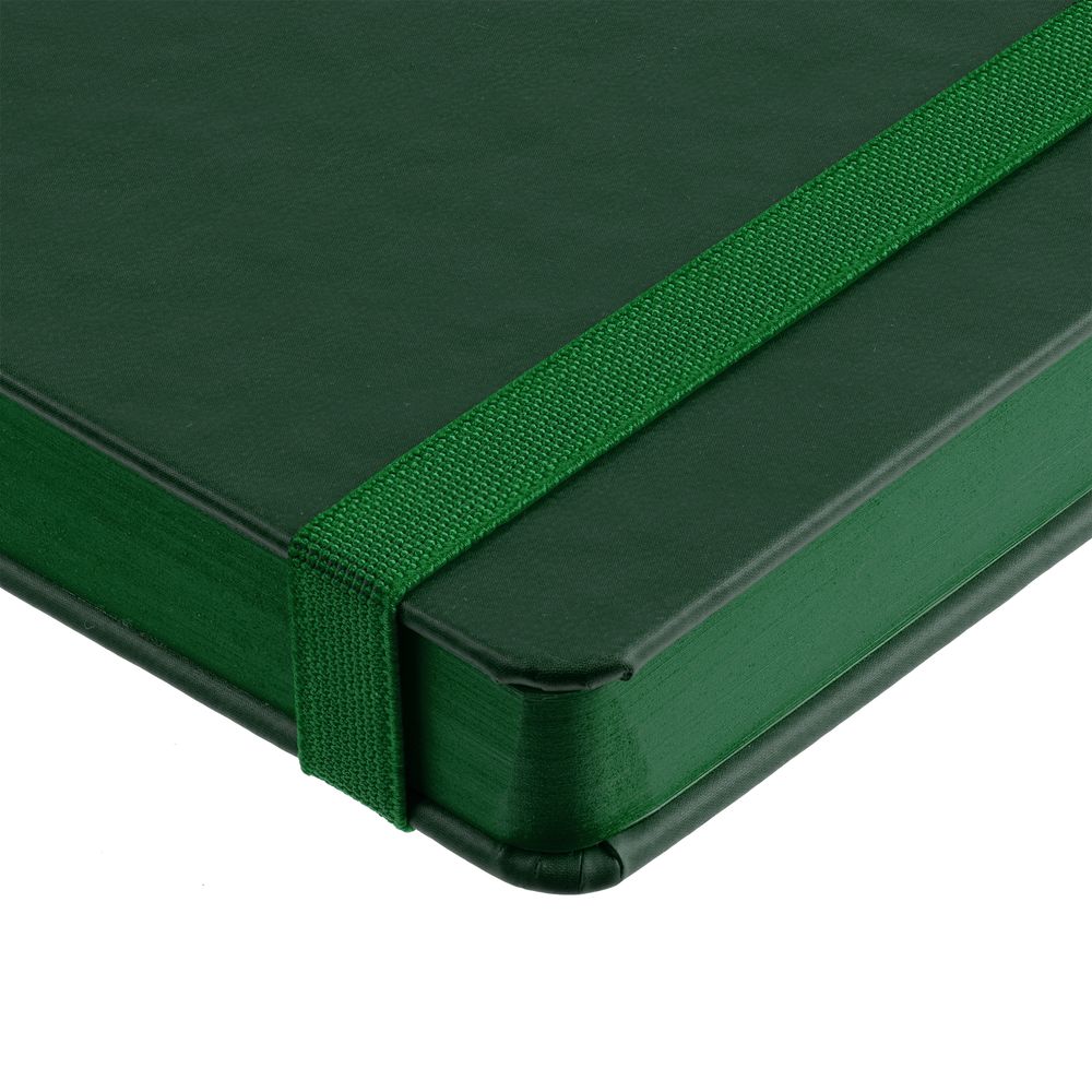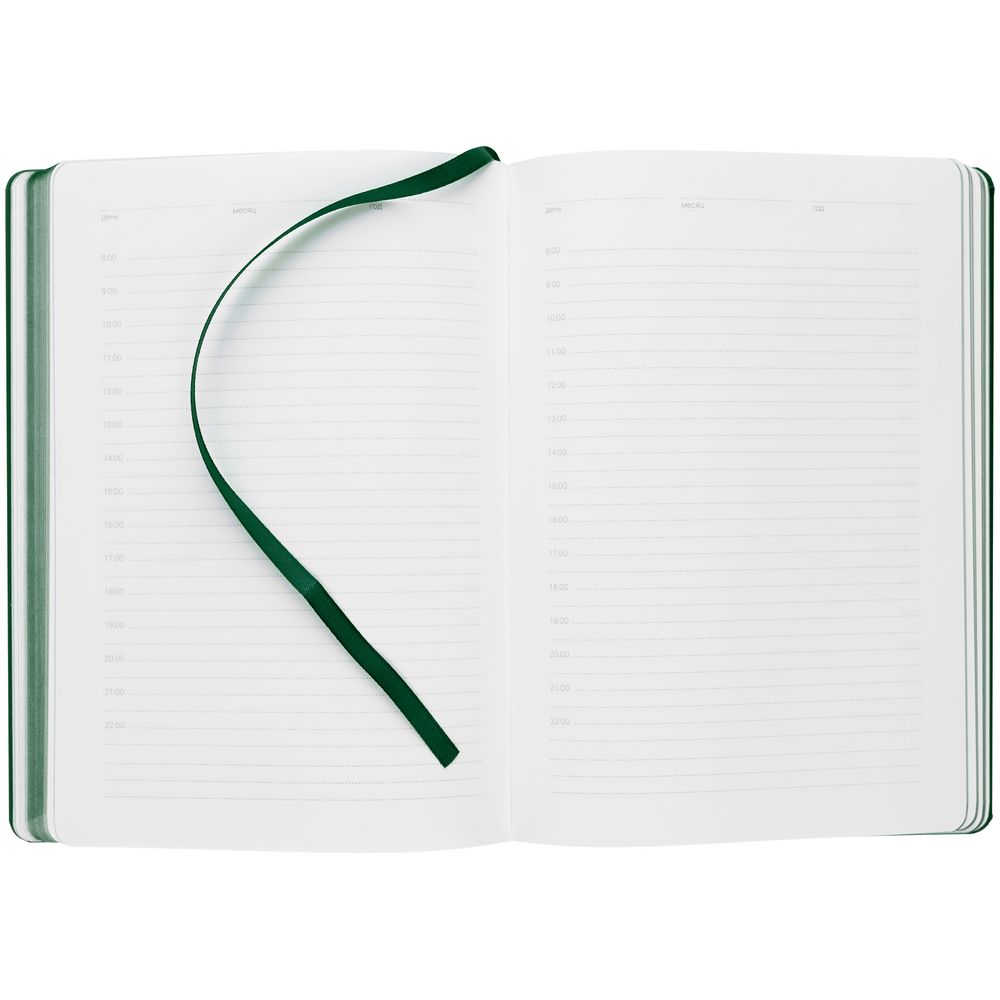 Ежедневник с твердой обложкой, выполнен из материала Latte, зеленый FF, обрез зеленого цвета, дополнен резинкой и ляссе зеленого цвета.