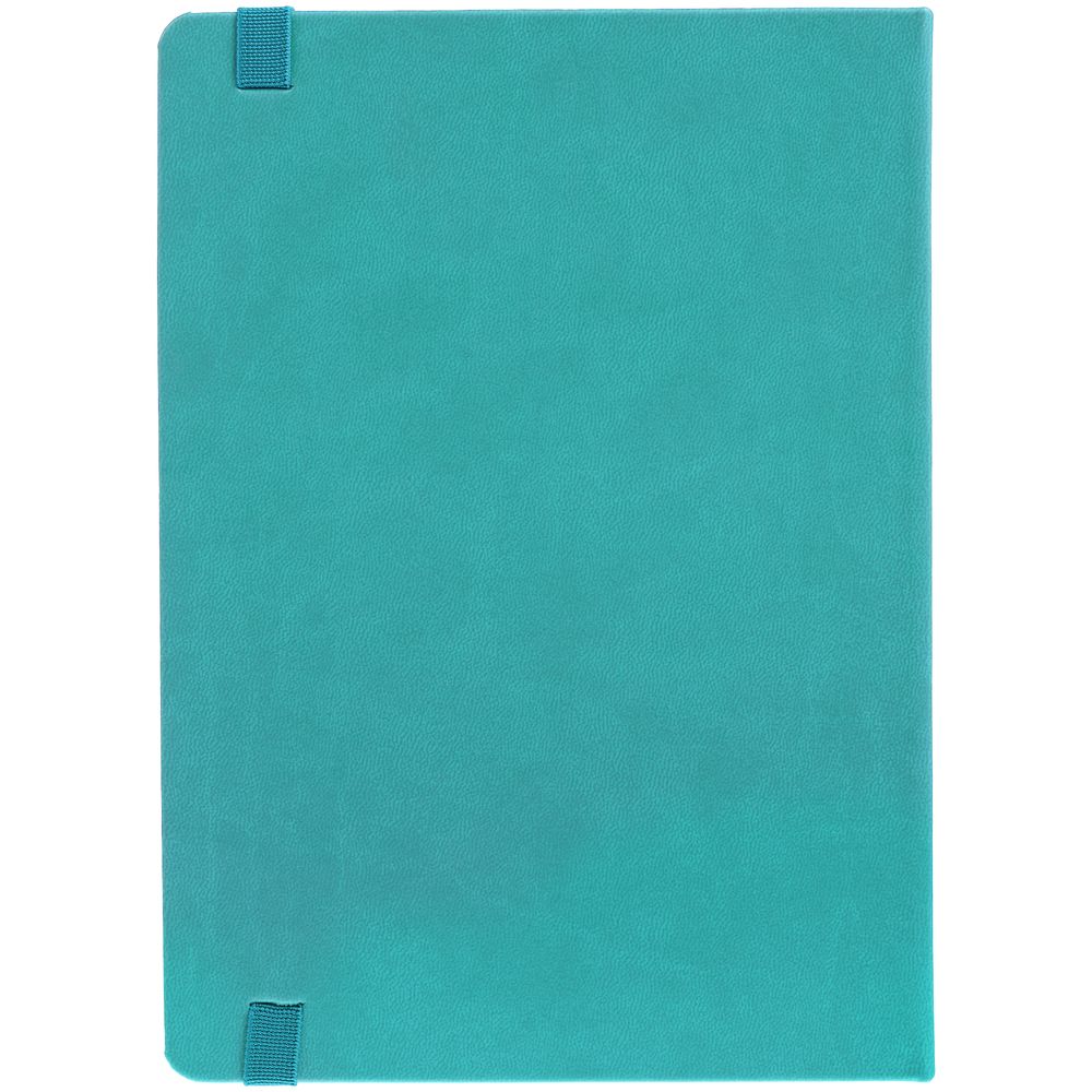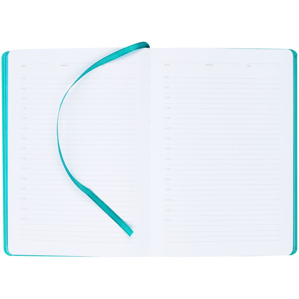 Ежедневник с твердой обложкой, выполнен из материала Latte, цвет морской волны II, обрез бирюзового цвета, дополнен ляссе бирюзового цвета и резинкой с металлическим шильдом.