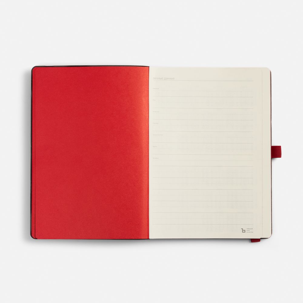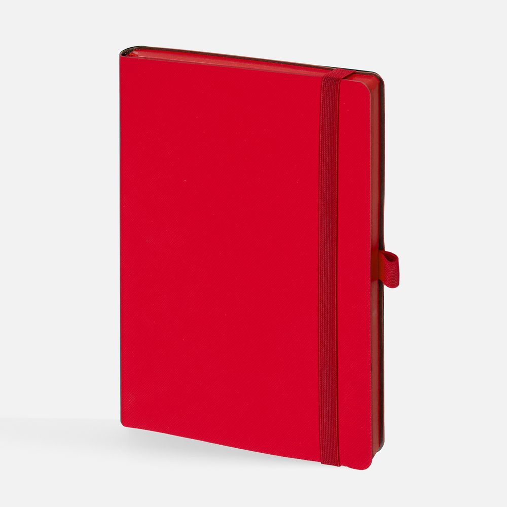 Ежедневник с гибкой обложкой, выполнен из материала Nice Touch Ultra, красный РР, дополнен цветными ляссе и петлей-резинкой для ручки.