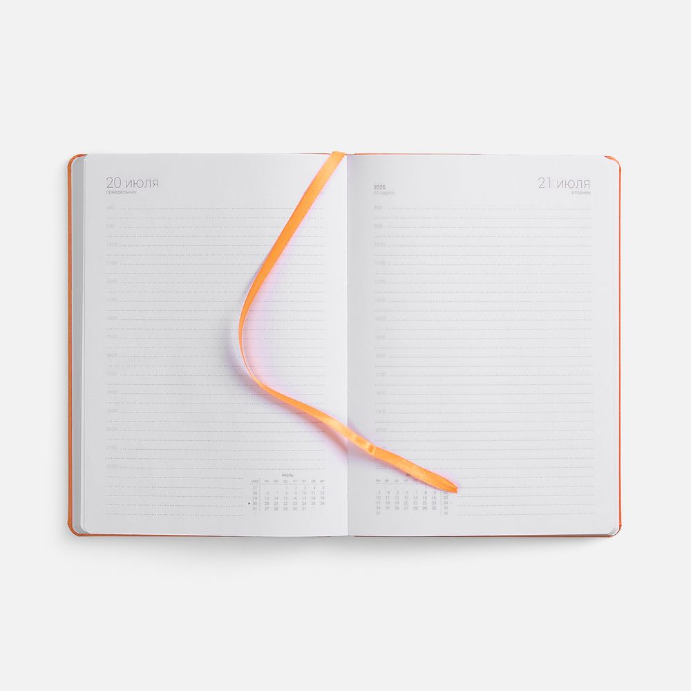 Ежедневник датированный на 2026 год.Ежедневник с твердой обложкой, выполнен из материала Latte, оранжевый ОО, дополнен ляссе в цвет обложки.