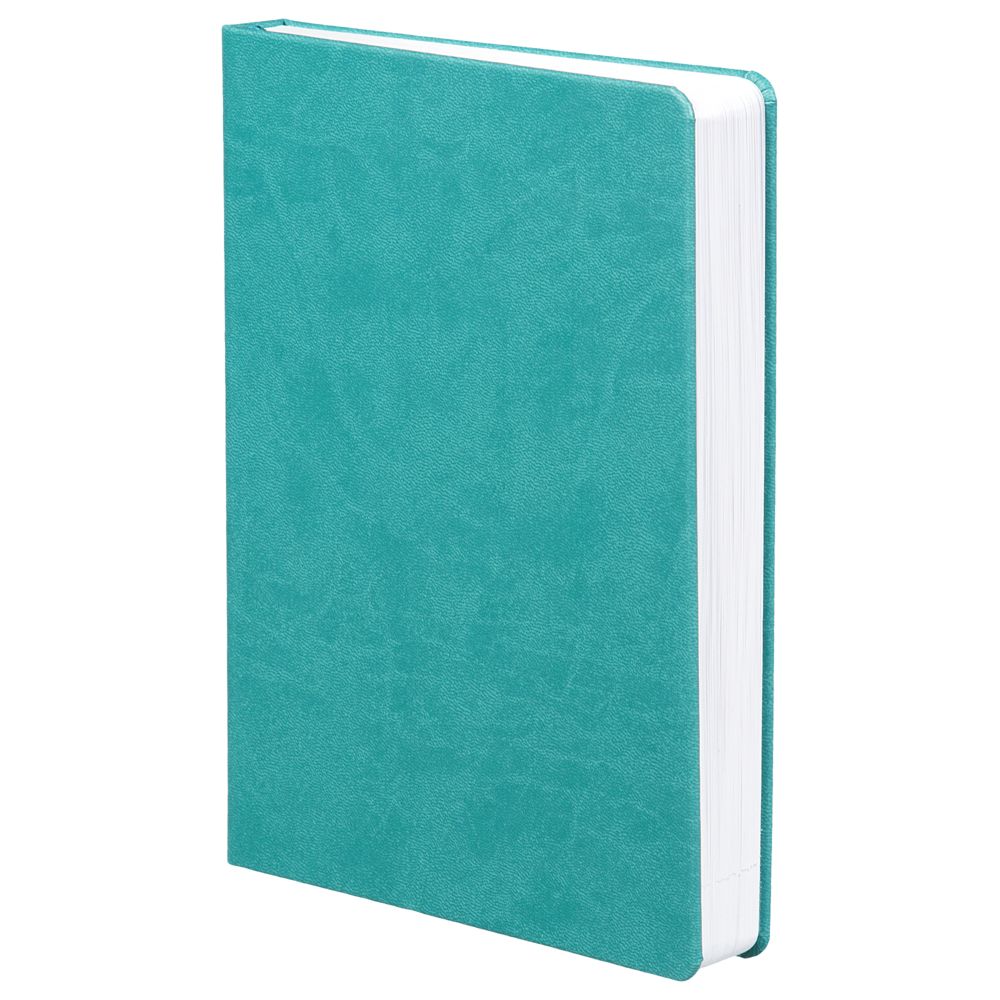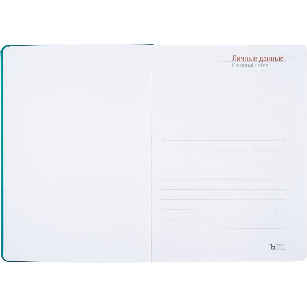 Ежедневник с твердой обложкой, выполнен из материала Latte, цвет морской волны II, дополнен ляссе в цвет обложки.