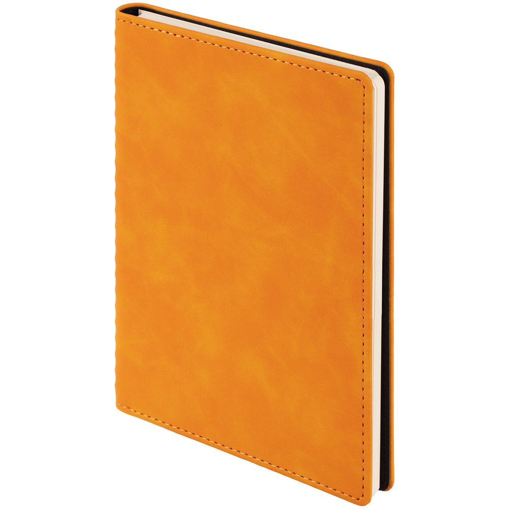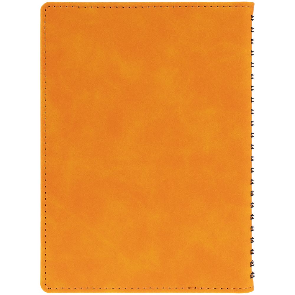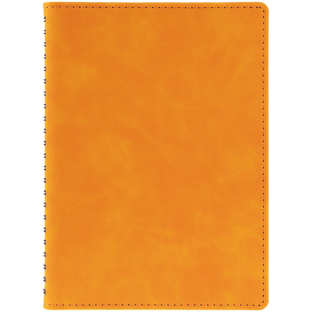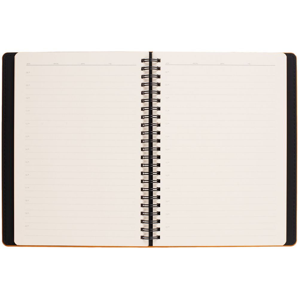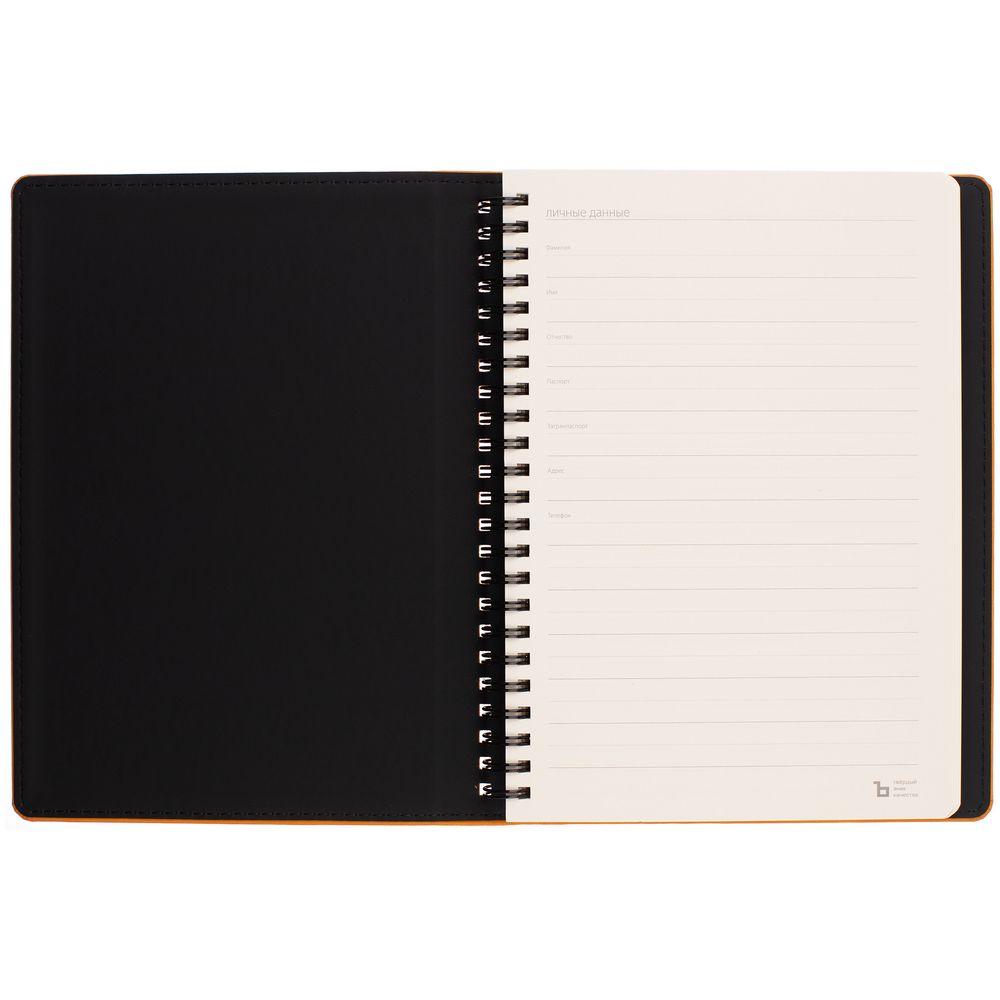Ежедневник с блоком на пружине в твердой обложке, выполнен из материалов Nubuk Touch, оранжевый ОО и Soft Touch, черный AA.
