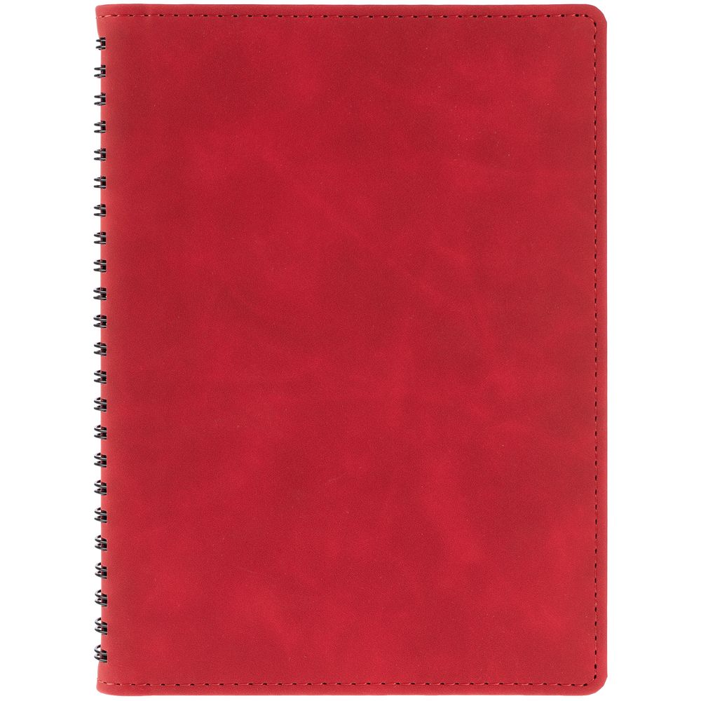 Ежедневник с блоком на пружине в твердой обложке, выполнен из материалов Nubuk Touch, красный PP и Soft Touch, черный AA.