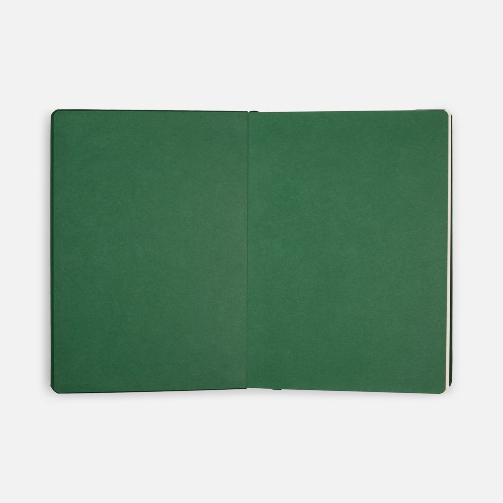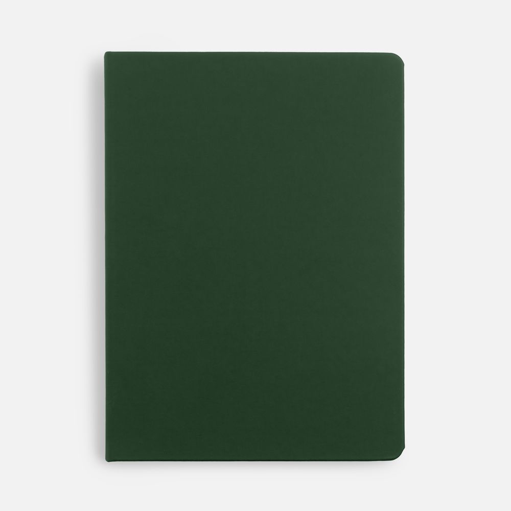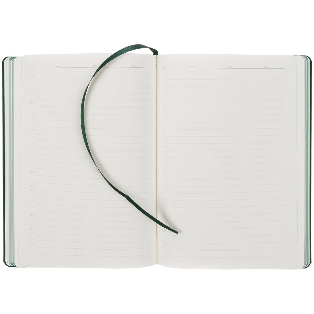 Ежедневник с твердой обложкой и тонированным обрезом, выполнен из материала Soft Touch, зеленый FF, дополнен ляссе в цвет обложки.