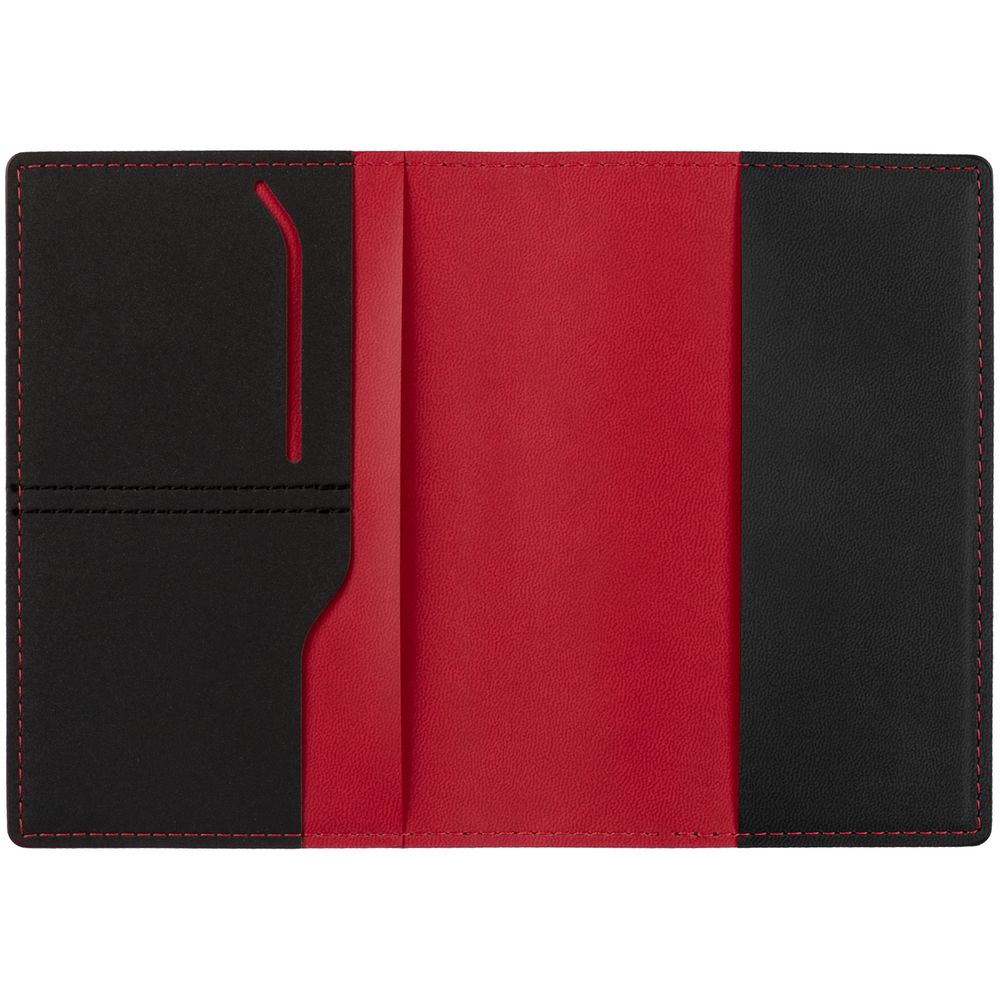 Имеет основное отделение для паспорта и 2 отделения для визиток или кредитных карт.