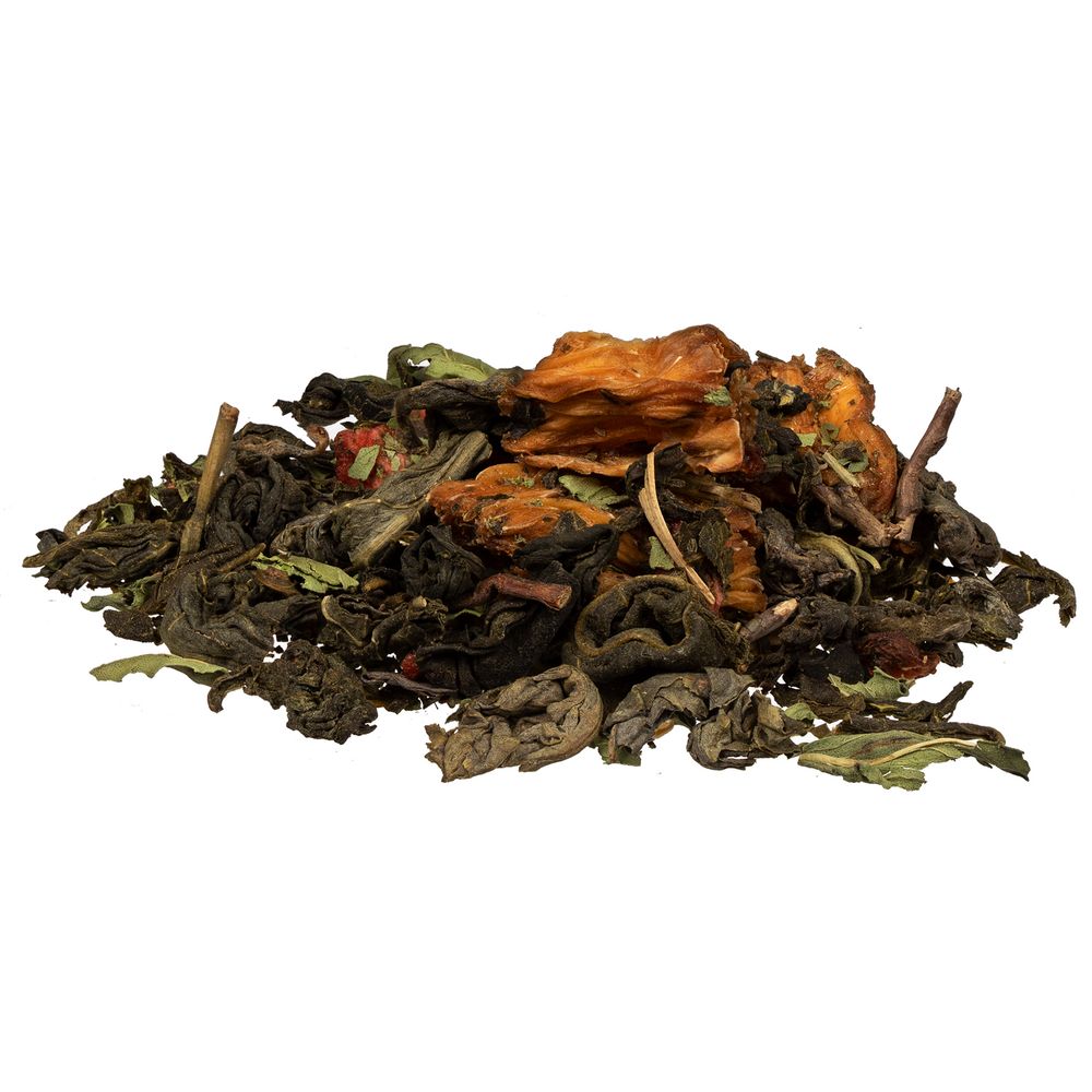 Состав: чай зеленый с ананасом и соком ананаса (чай зеленый байховый крупнолистовой, кусочки ананаса, сок ананаса), клубника сублимированная, мята сушеная, ароматизатор натуральный «Клубника».