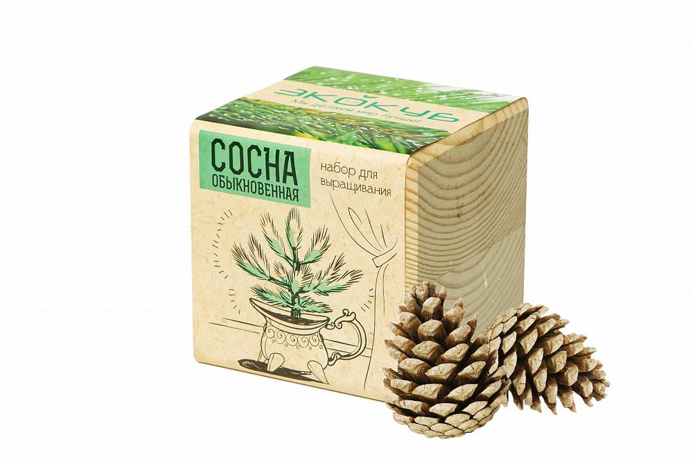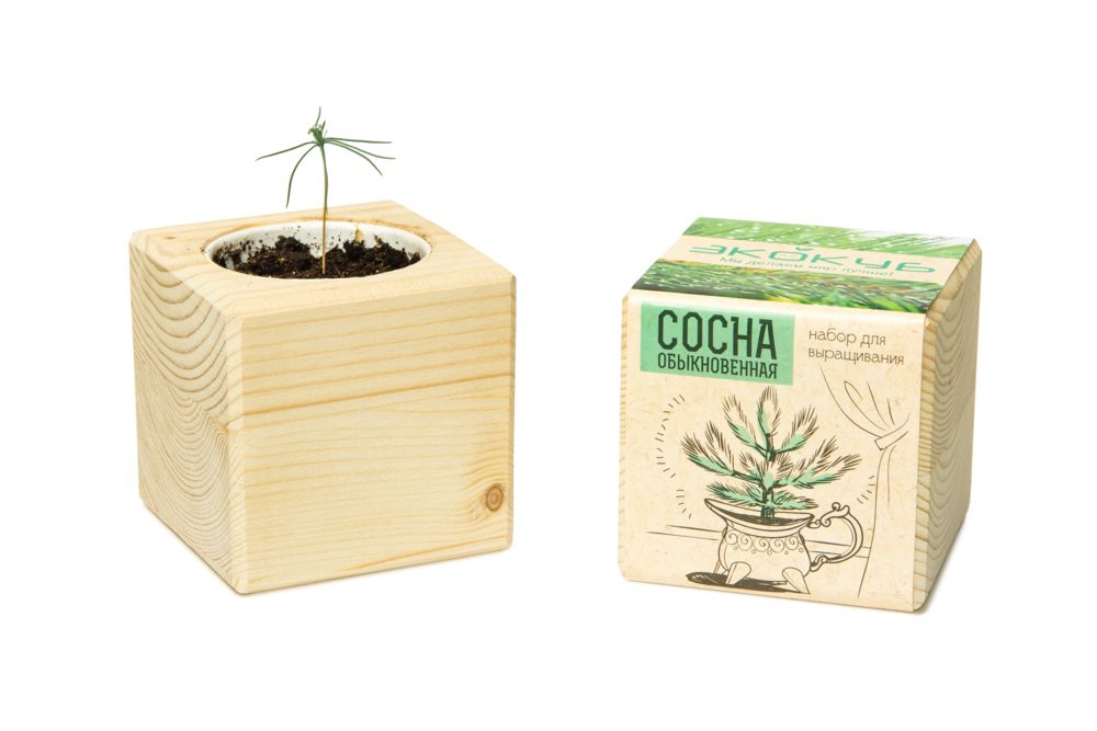 В наборе: деревянный куб, грунт, семена сосны.