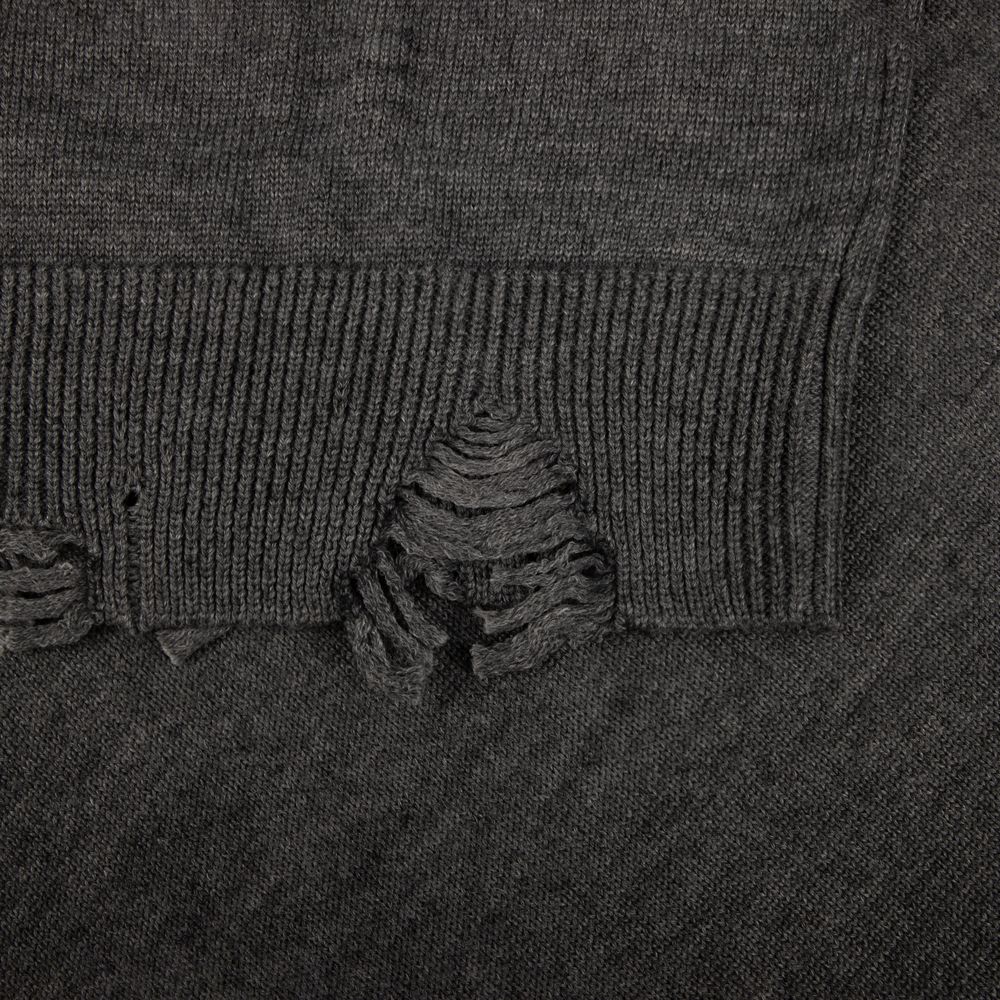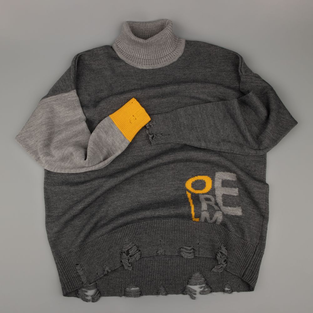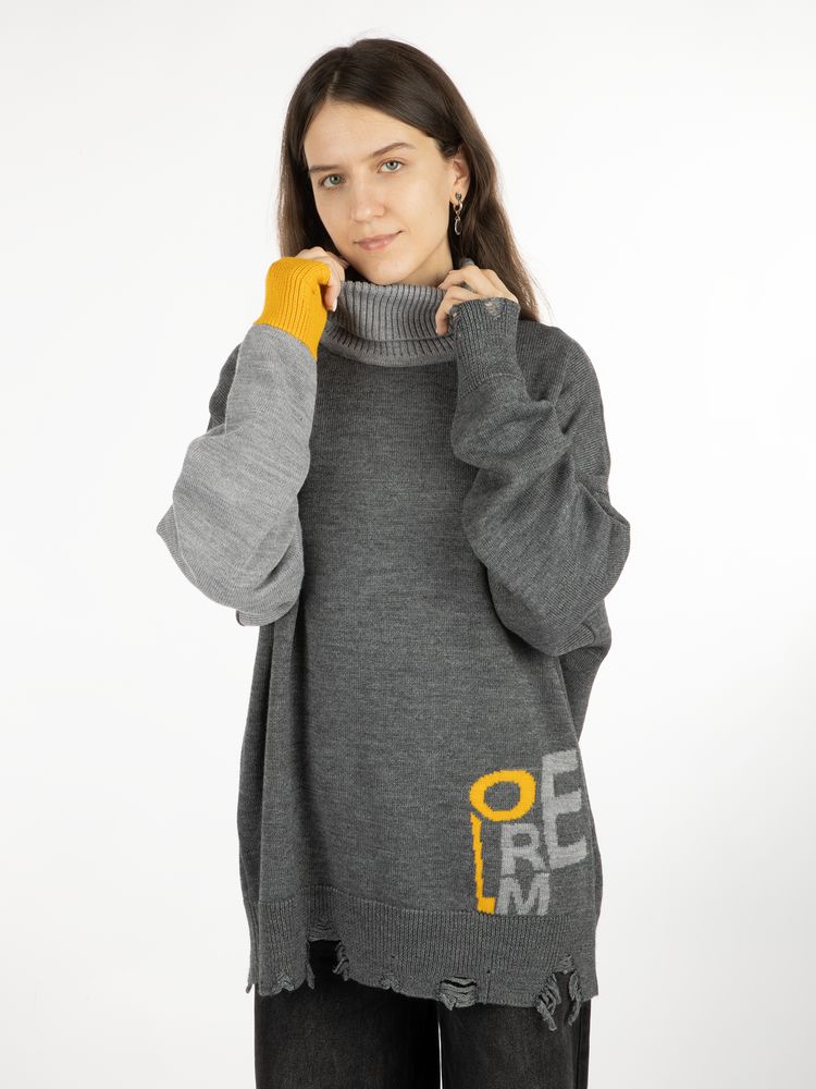 Модель: однотонный гладкий свитер унисекс, спущенное плечо. Ворот, манжеты и низ изделия вывязаны резинкой c добавлением эффекта «рваного» края.