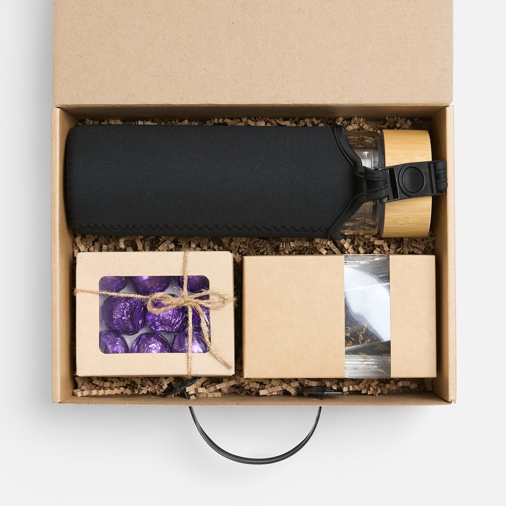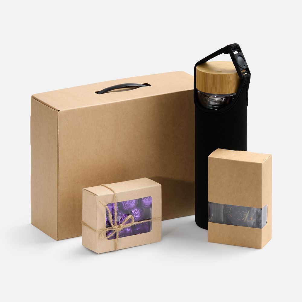 бутылка - боросиликатное стекло, нержавеющая сталь, бамбук, неопрен; коробка - картон, пластик