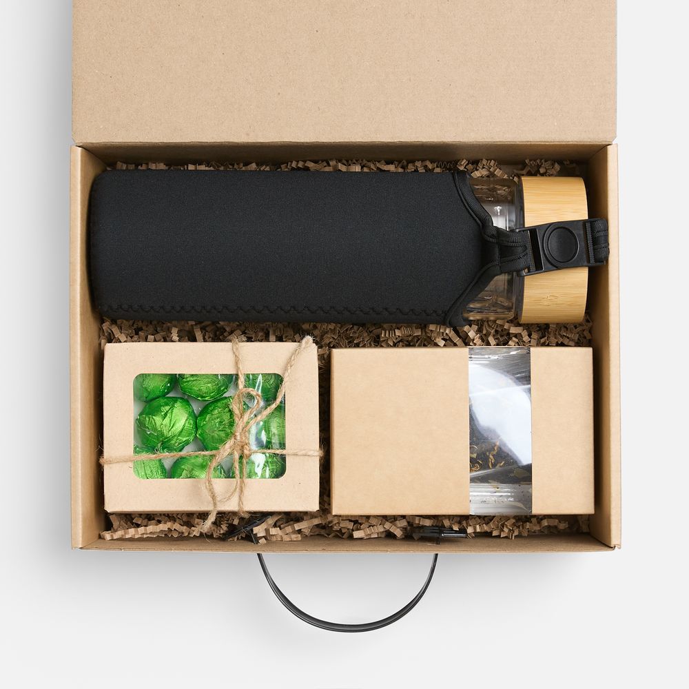 бутылка - боросиликатное стекло, нержавеющая сталь, бамбук, неопрен; коробка - картон, пластик
