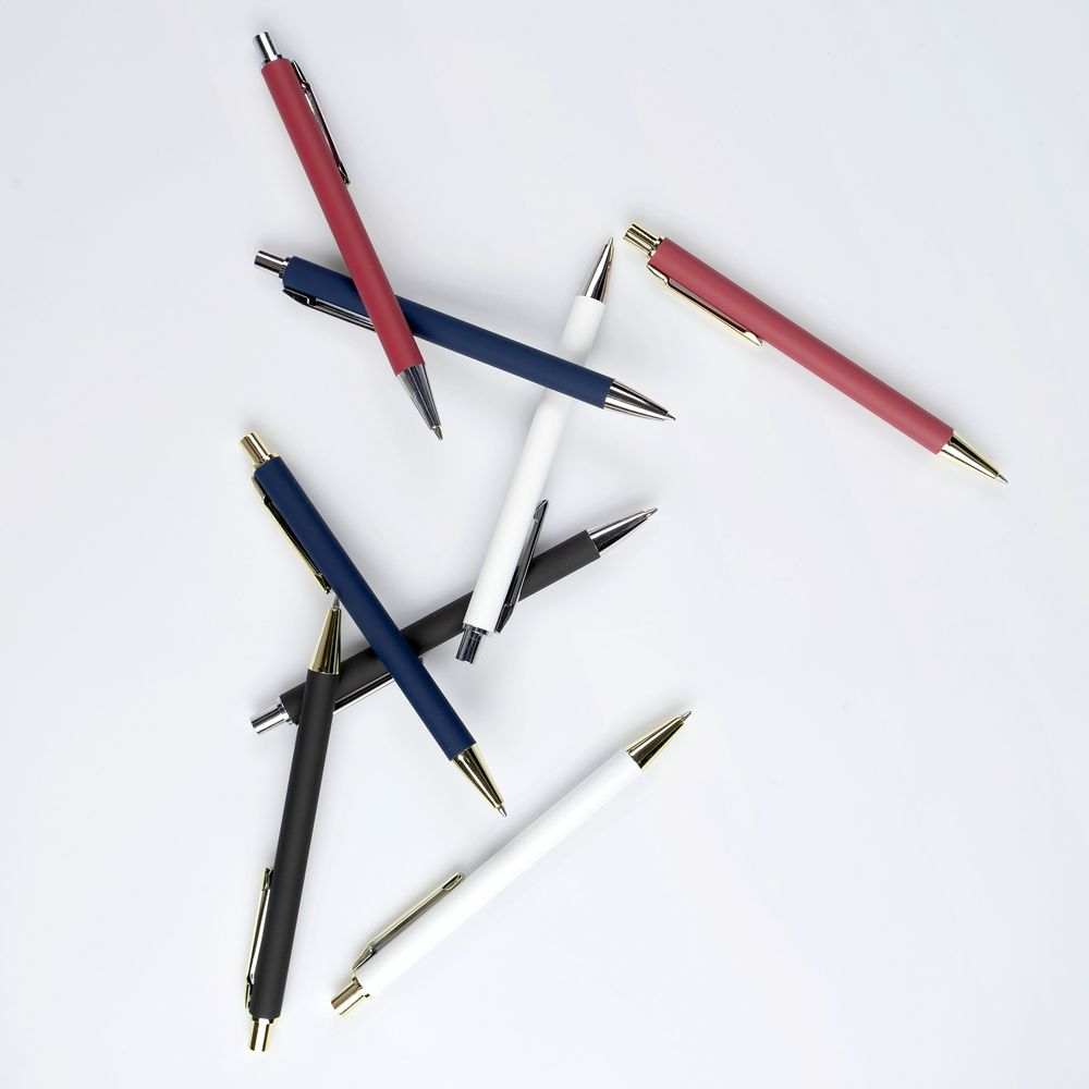 Шариковая ручка с покрытием софт-тач и золотистыми деталями. Клип оригинальной формы.