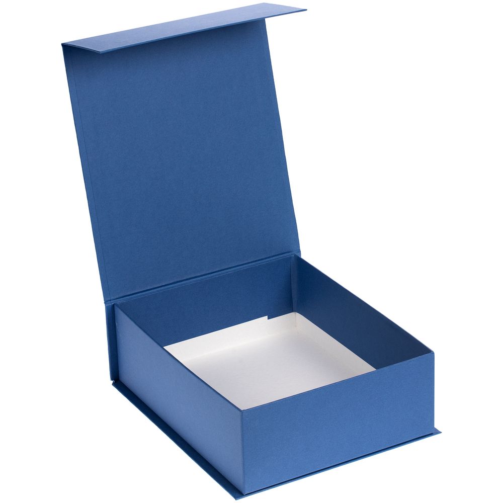 Изготовлена из переплетного картона, снаружи кашированного гладкой дизайнерской бумагой Malmero «Скандинавский синий», с крышкой на магните. Конструкция коробки предусматривает наличие технологического зазора шириной до 2 мм по линии сопряжения короба и крышки.